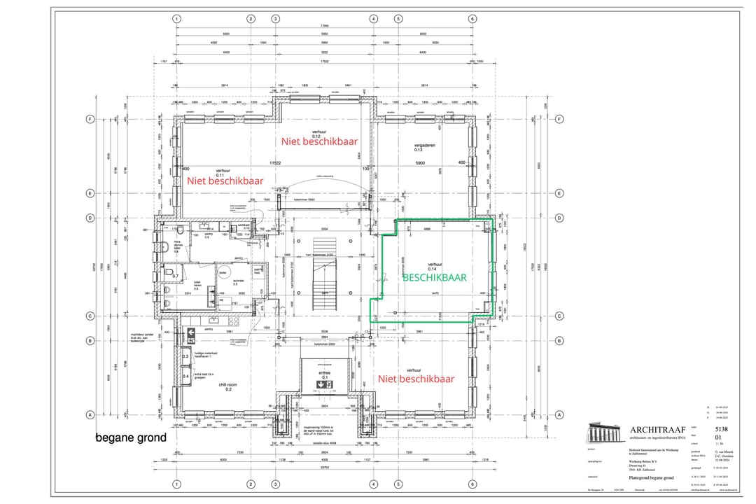 De beschikbare unit is gelegen aan de zijkant van het gebouw, zoals ook weergegeven op de plattegrond. Dankzij deze ligging beschikt de ruimte over een prettige lichtinval en een rustige positionering binnen het geheel.