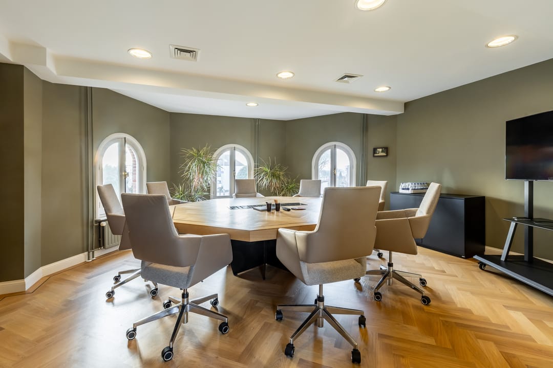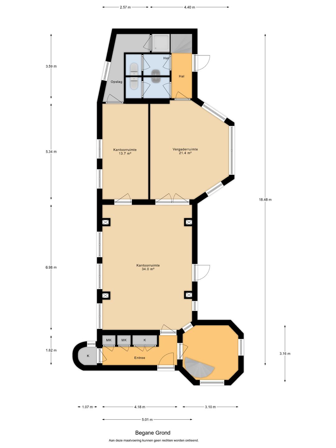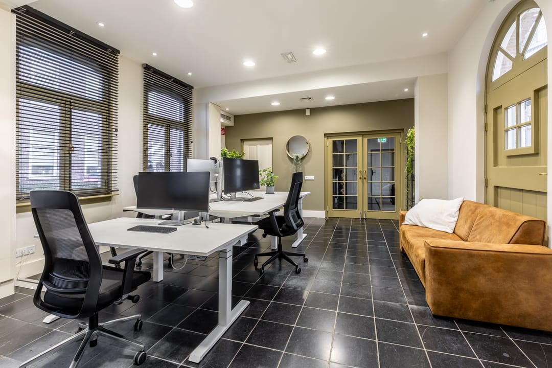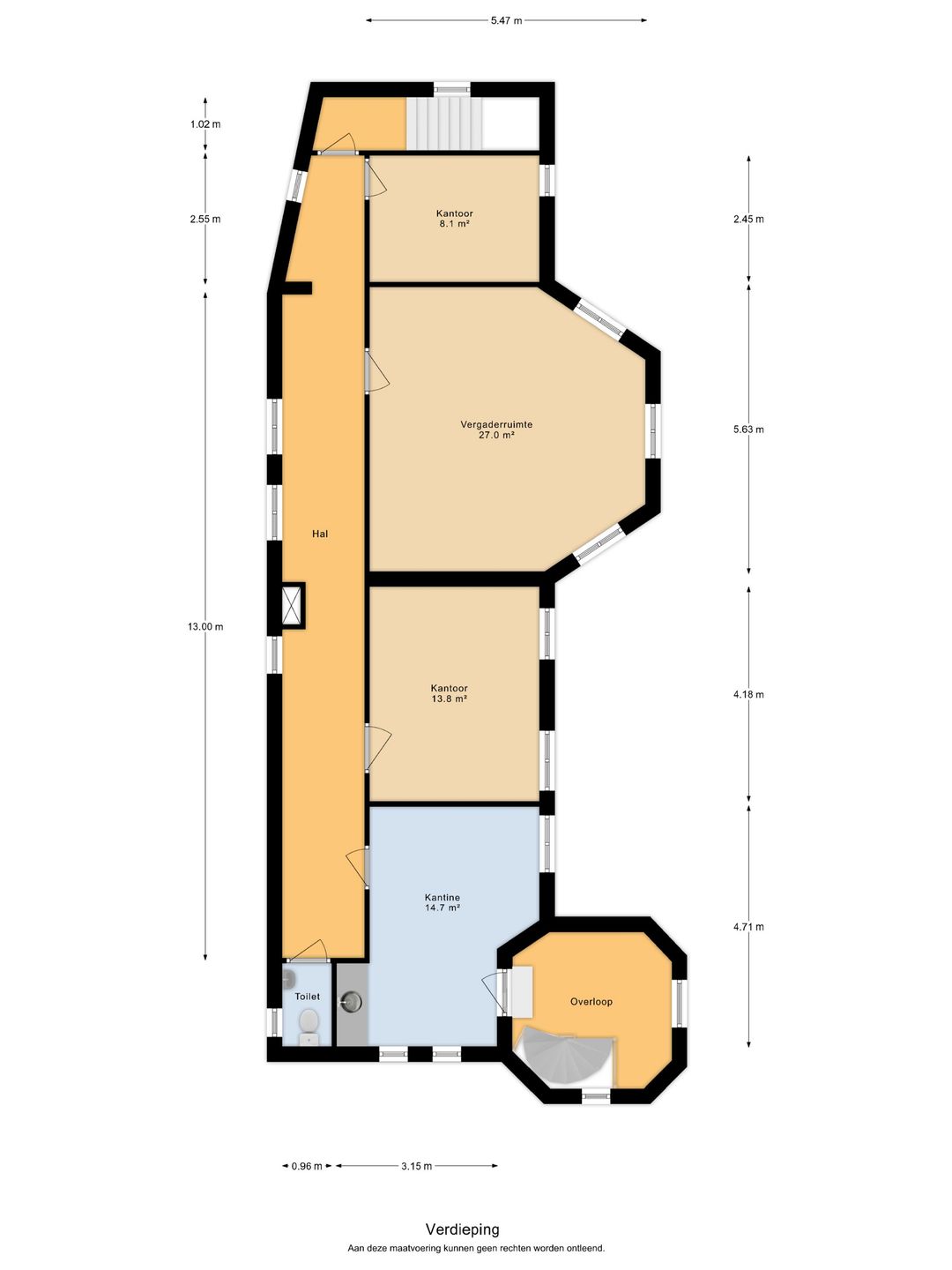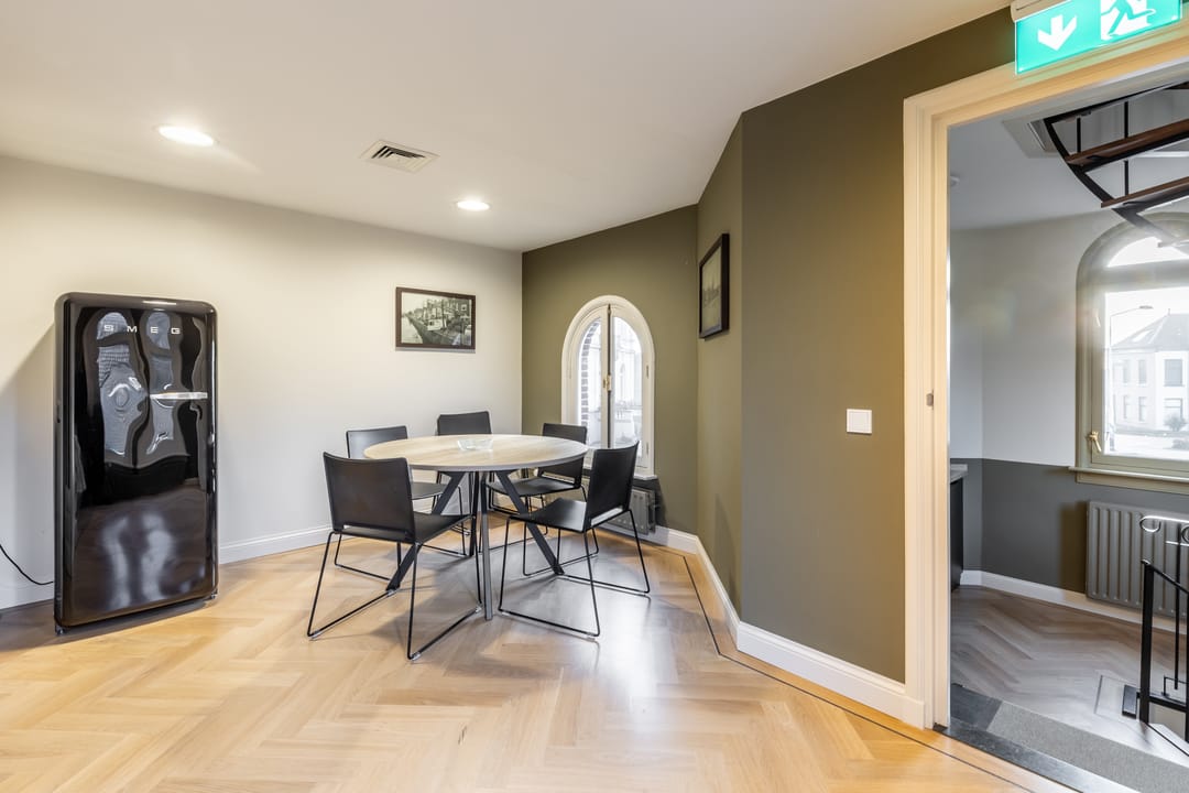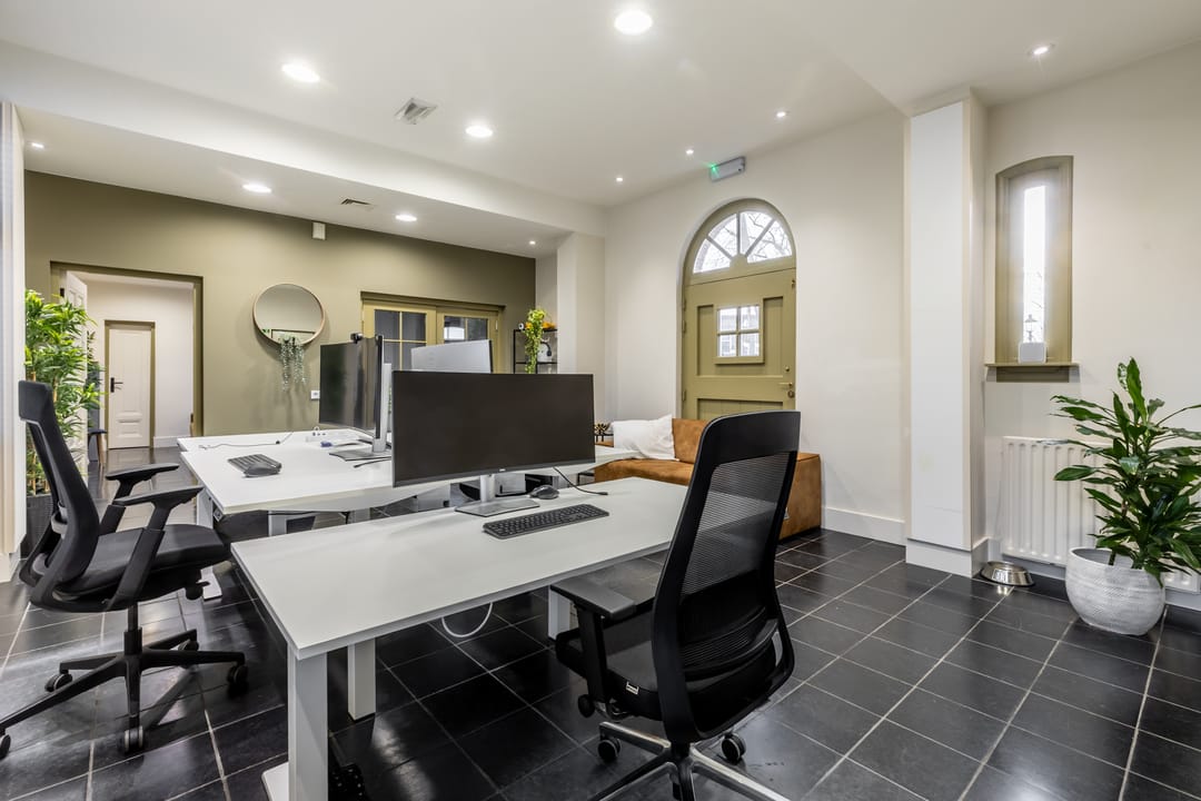 Entree met trap naar verdieping, kantoortuin in twee delen en een tweede entree, met pantry en trap naar verdieping. Op verdieping zijn nog drie kantoorruimtes. Tenslotte is er nog een archiefzolder.