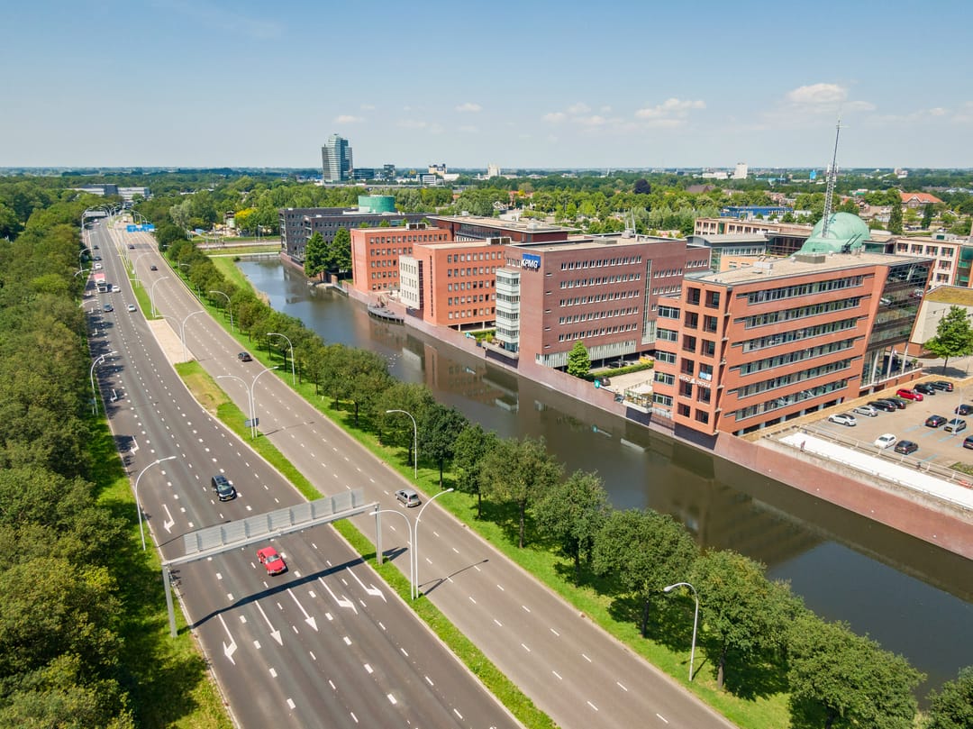 Parkeren is mogelijk onder en naast het kantoorgebouw.