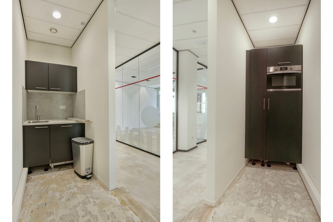 Op de 1e etage tref je dit instapklare kantoor, voorzien van alle gemakken om jouw kantoor te huisvesten. Een eigen pantry/keuken en een modern inbouwpakket met glazen wanden, om zo verschillende kantoren/spreekruimtes te creëren. Uiteraard is een en ander naar eigen wens aan te passen.