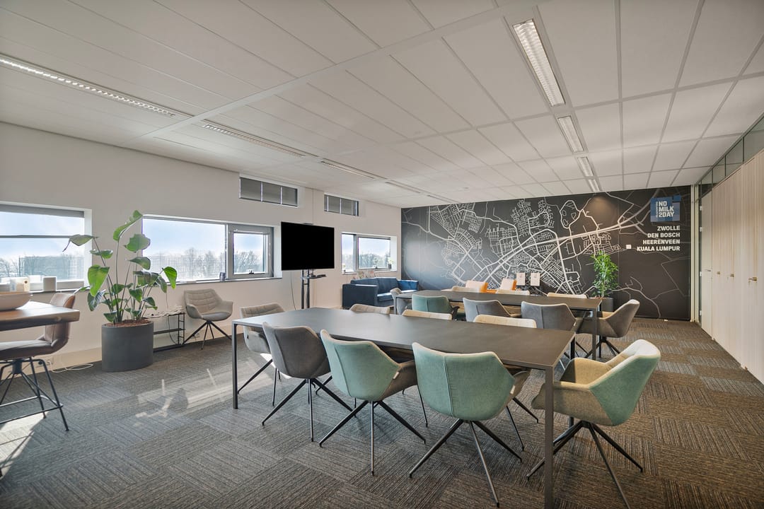 Zeer ruime hoeveelheid parkeerplaatsen beschikbaar aan de achterzijde van het complex. Uniek voor een kantoorgebouw op een locatie nabij de A28 en aan de ringweg van Zwolle.