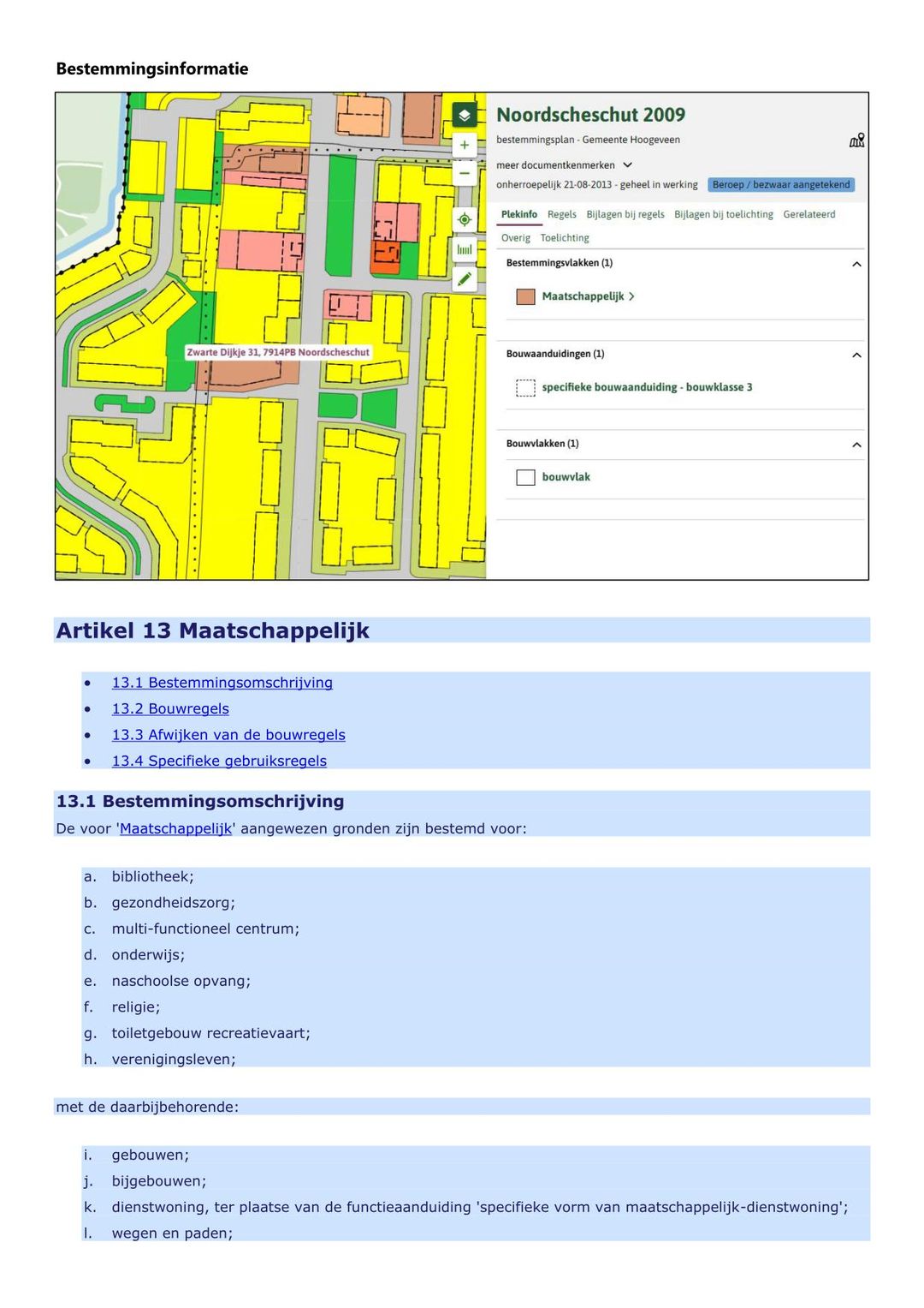 Bestemmingsplan Noordscheschut 2009, onherroepelijk vastgesteld op 21 augustus 2013. De bestemming is ‘Maatschappelijk’, bouwklasse 3. De voor 'Maatschappelijk' aangewezen gronden zijn bestemd voor bibliotheek, gezondheidszorg, multifunctioneel centrum, onderwijs, naschoolse opvang, religie, toiletgebouw recreatievaart, verenigingsleven.