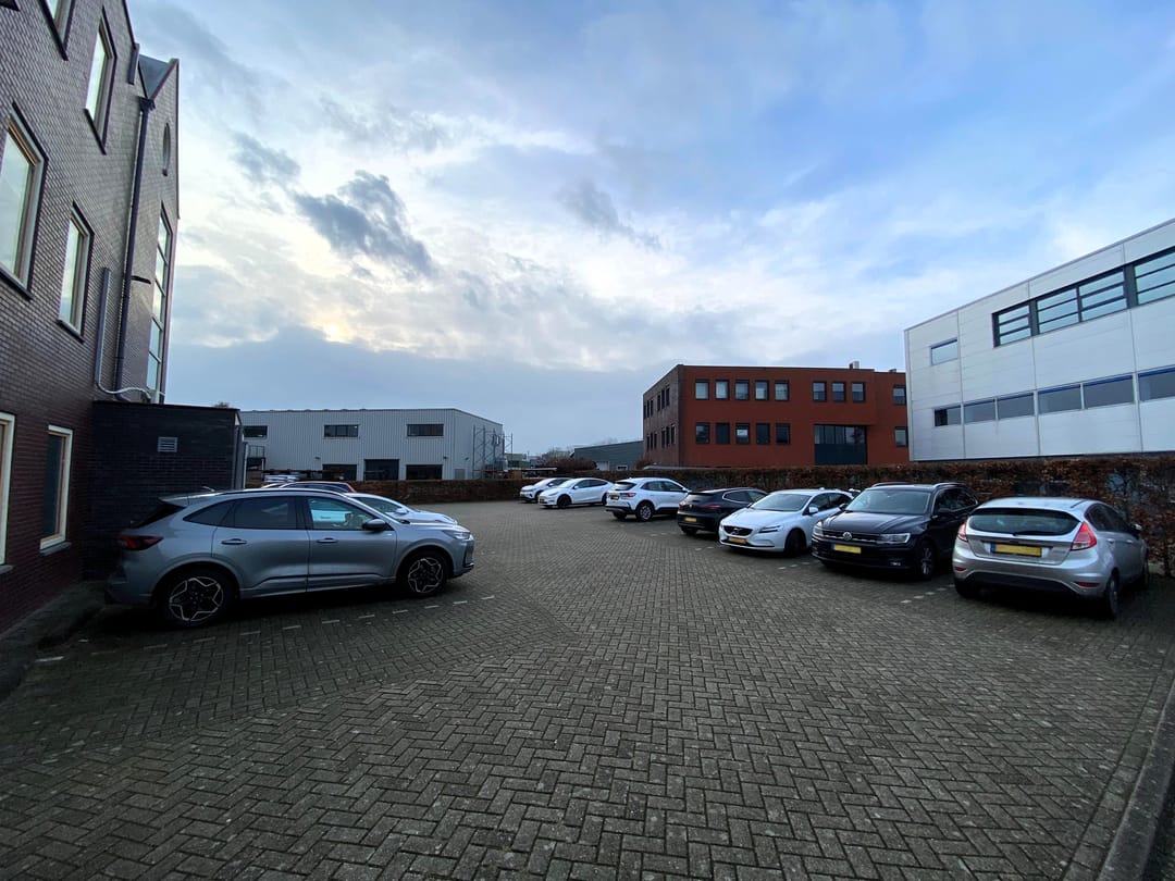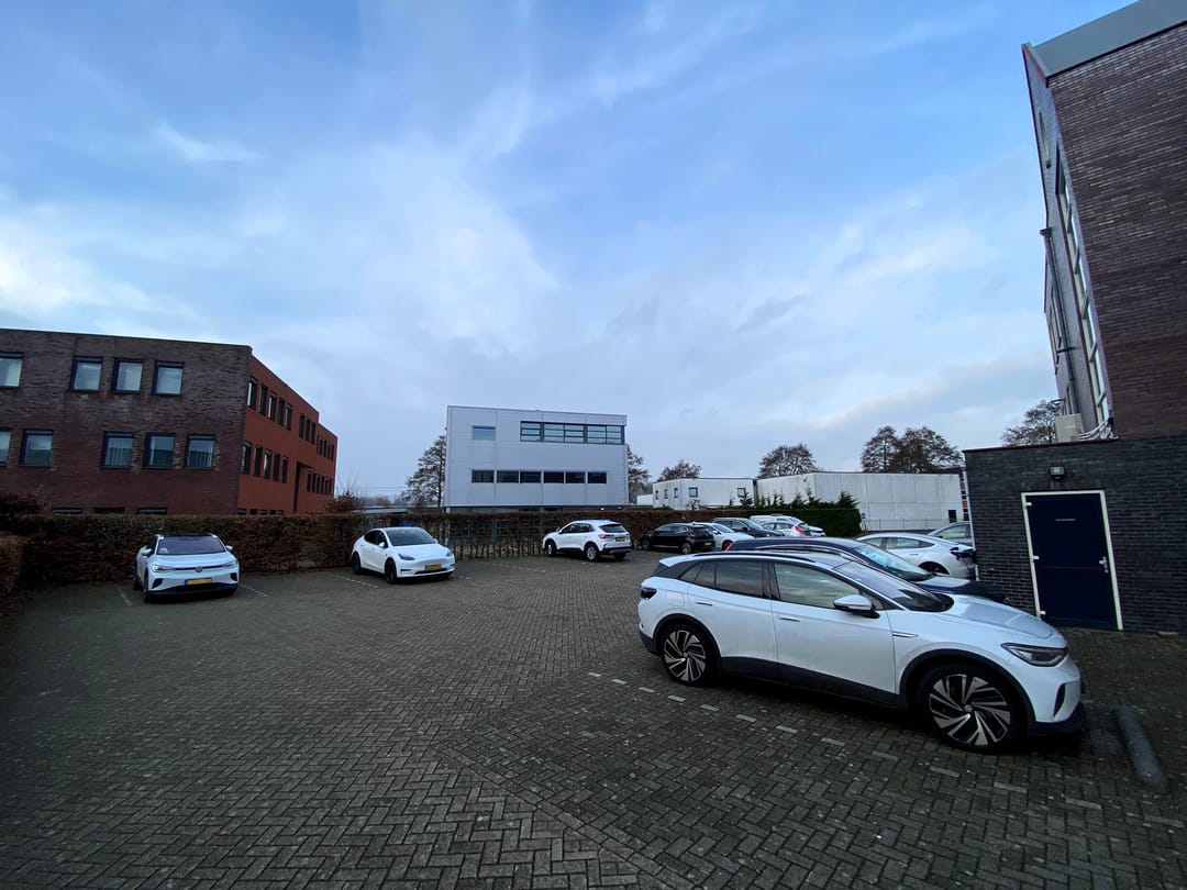 Achter het complex ligt een parkeerterrein (totaal 23 parkeerplaatsen) met drie laadpalen.