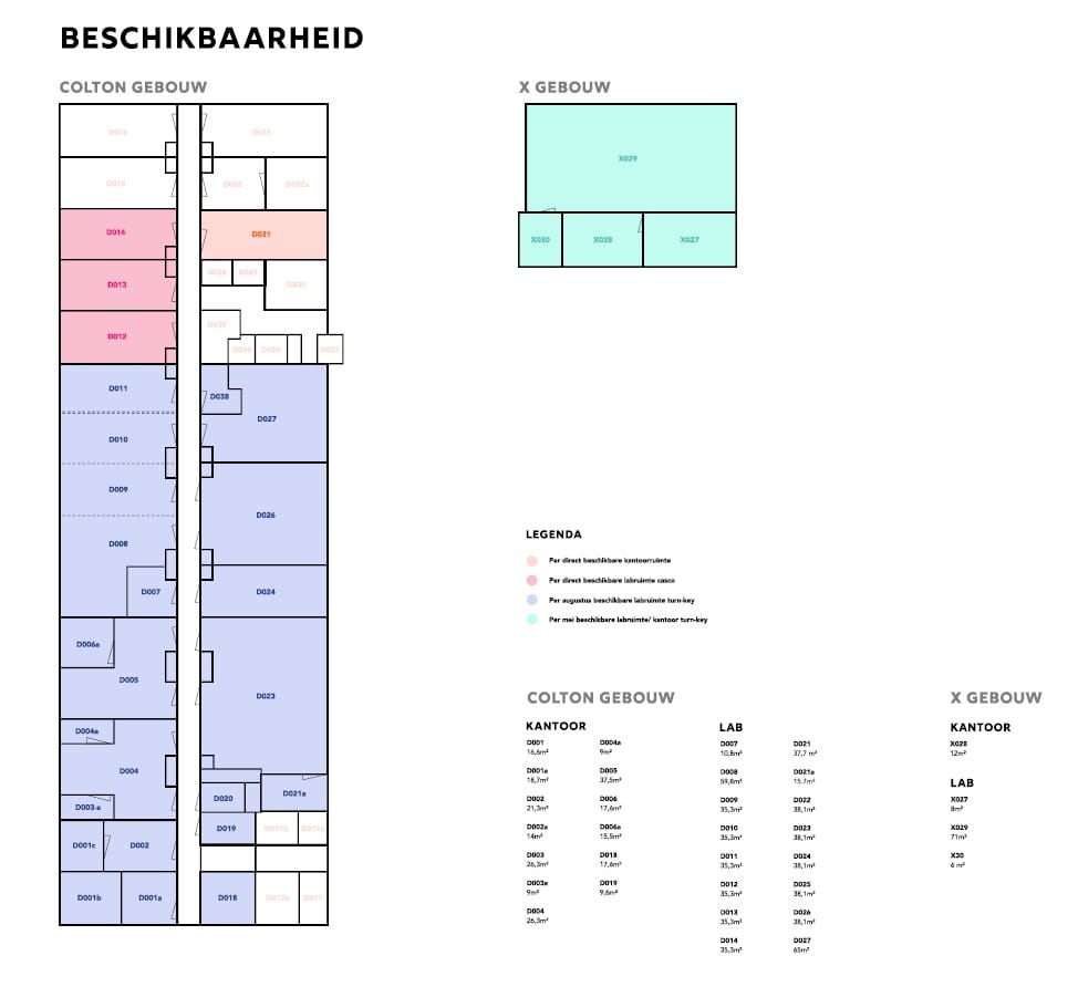 Het totaal aantal m² kan daarbij ook uitgebreid worden door samenvoeging met de naastgelegen units vanaf 35 m² tot circa 910 m² en extra 39 m² kantoorruimte.