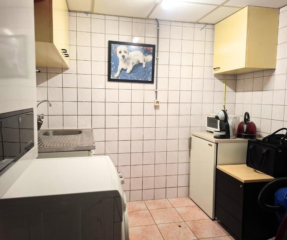 Bij binnenkomst kom je in een fijne ruimte van circa 20 m2 voorzien van een vinyl vloer, betegelde en stucwanden, houten lambrisering en een platen plafond.