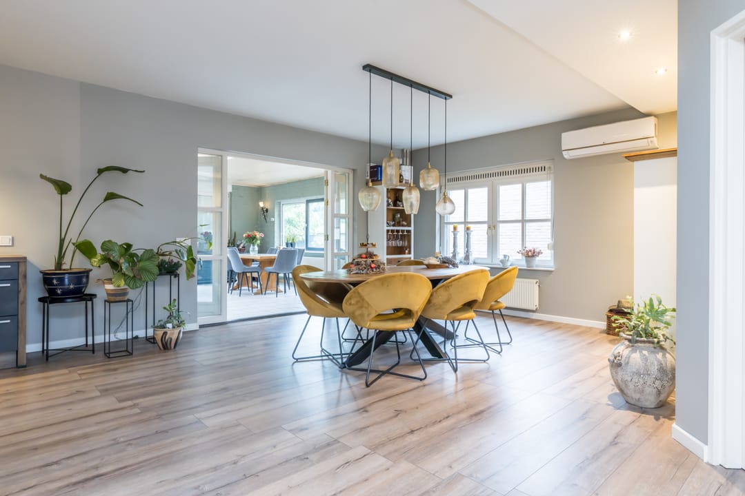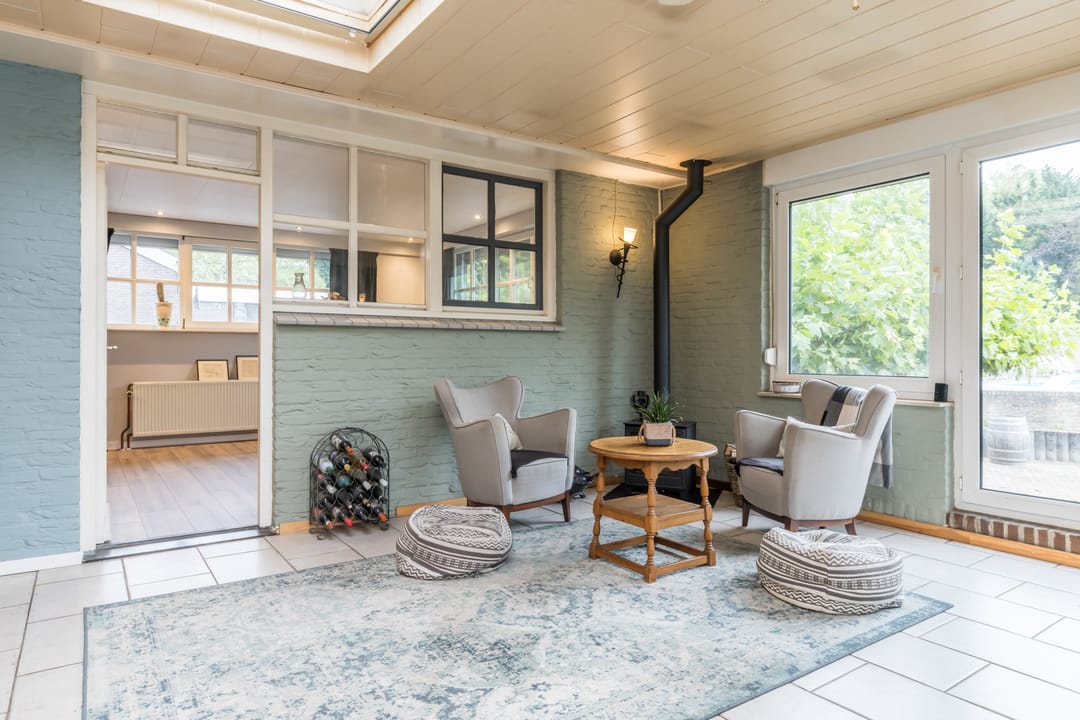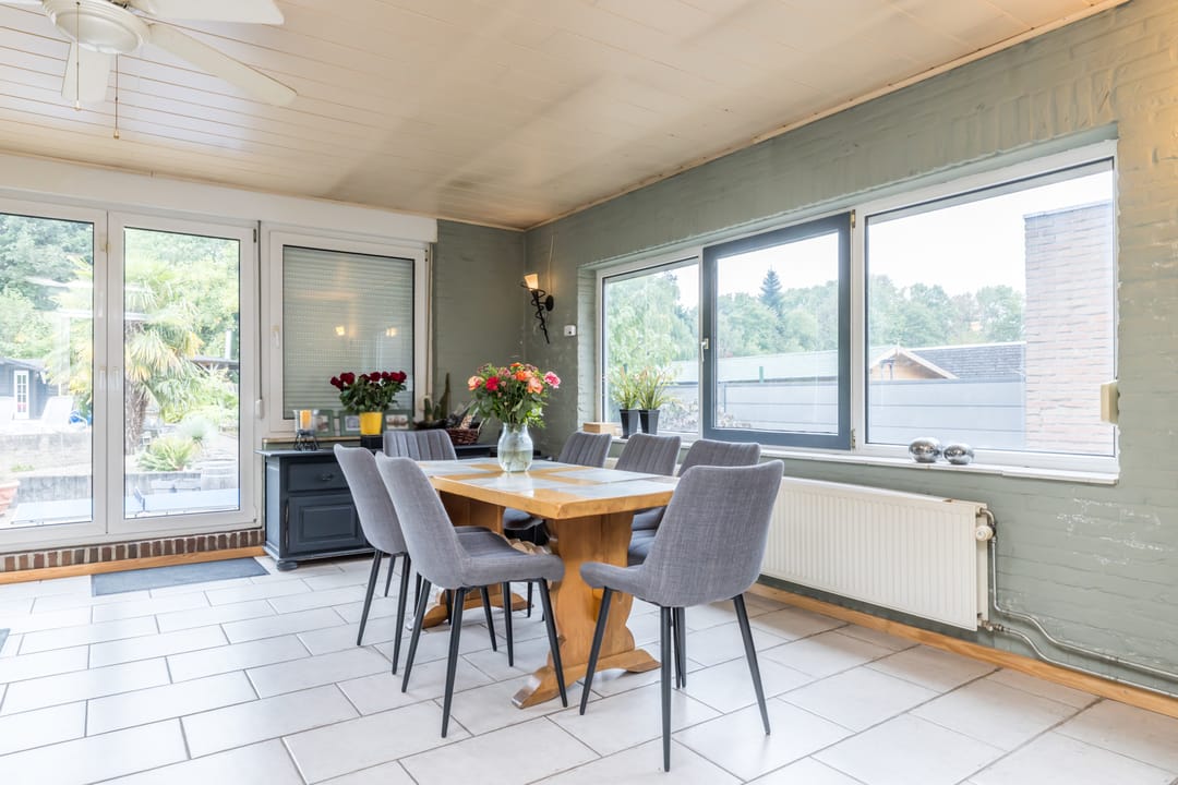 In het verlengde van de woonkamer is de eetkamer of tuinkamer (5.30 x 6.07m) gerealiseerd met een sfeervolle houtkachel en een tegelvloer. Openslaande deuren geven toegang tot de achtertuin en de raampartijen in combinatie met de lichtkoepels zorgen voor voldoende daglichttoetreding.