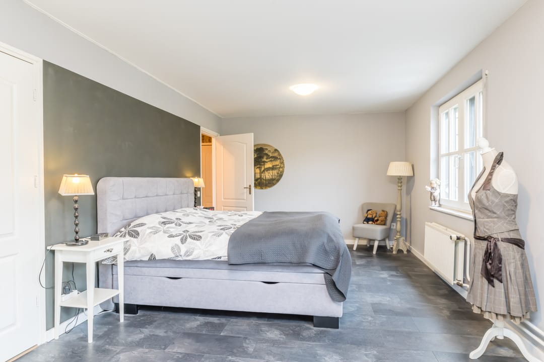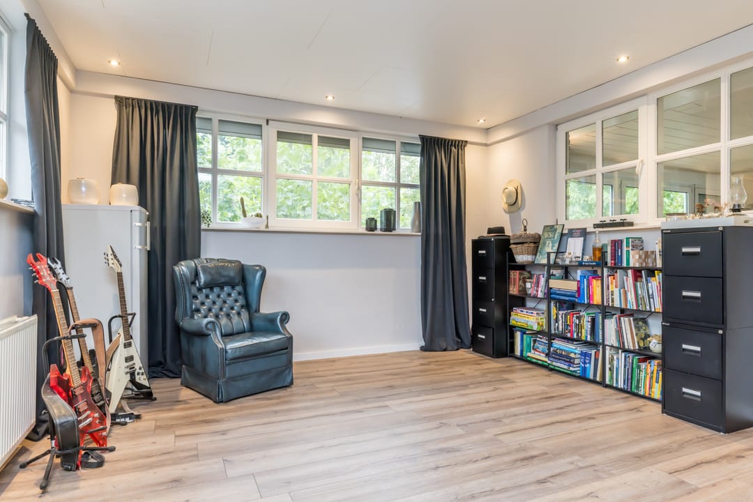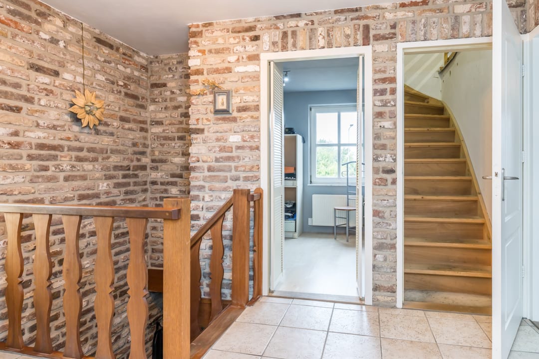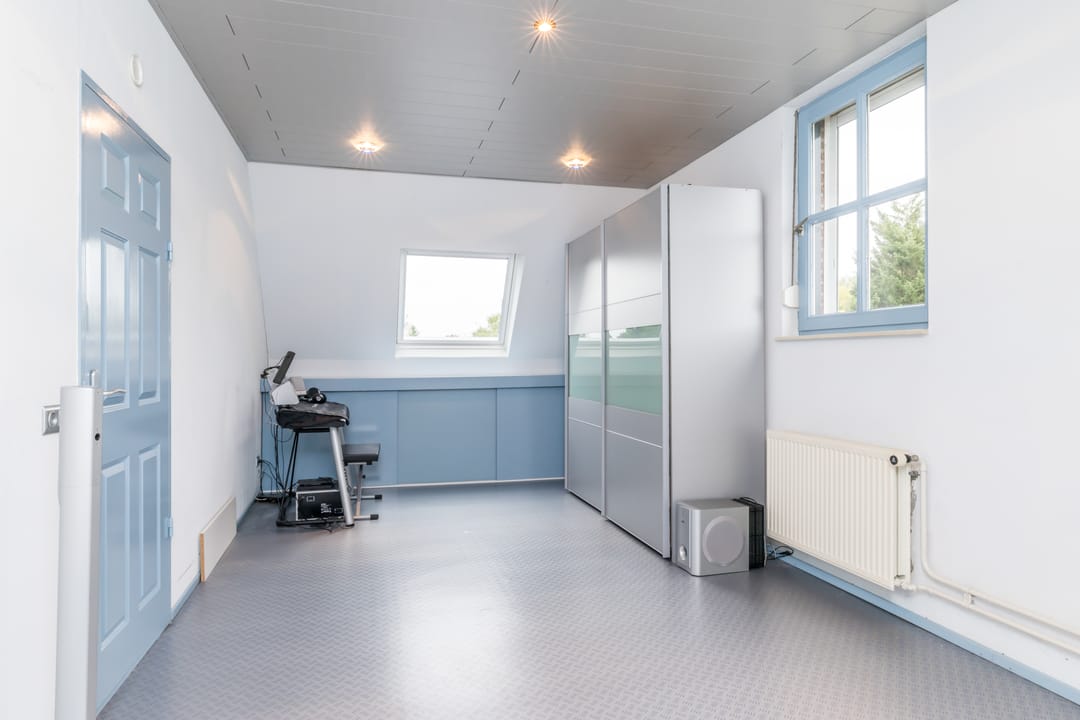 Naast de tuinkamer ligt een hobby of slaapkamer (5.30/4.16 x 4.27m) met een directe toegang tot de bijkeuken via een gang met kasten aan beide zijden. Realisatie van een badkamer behoort hier tot de mogelijkheden. Ook de bergzolder is vanuit deze kamer toegankelijk.