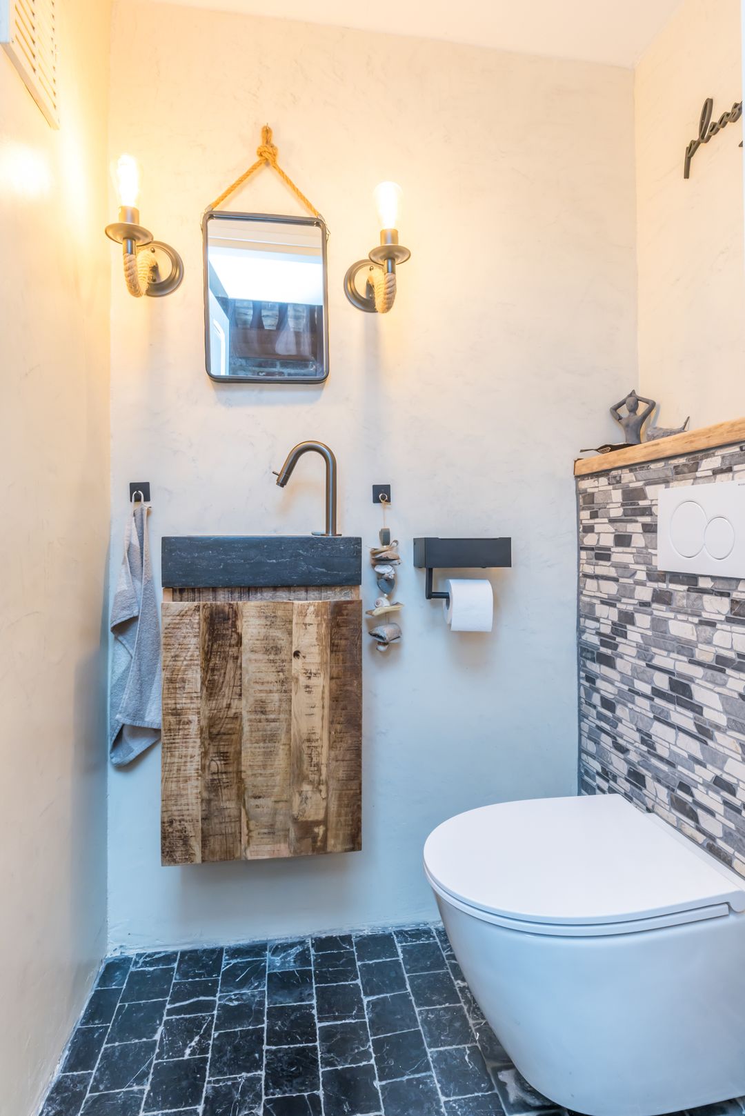 De ontvangsthal is ruim met hierin de trapopgang naar de eerste verdieping, de betegelde toiletruimte met zwevend closet en de trap naar het souterrain.