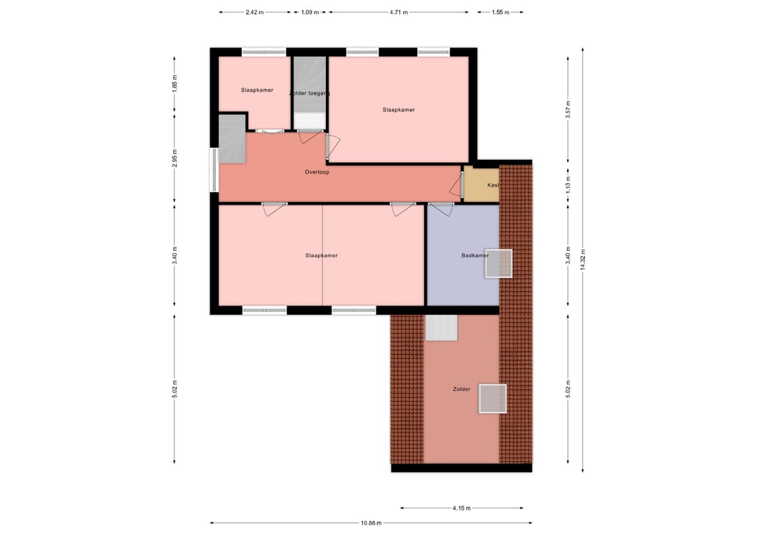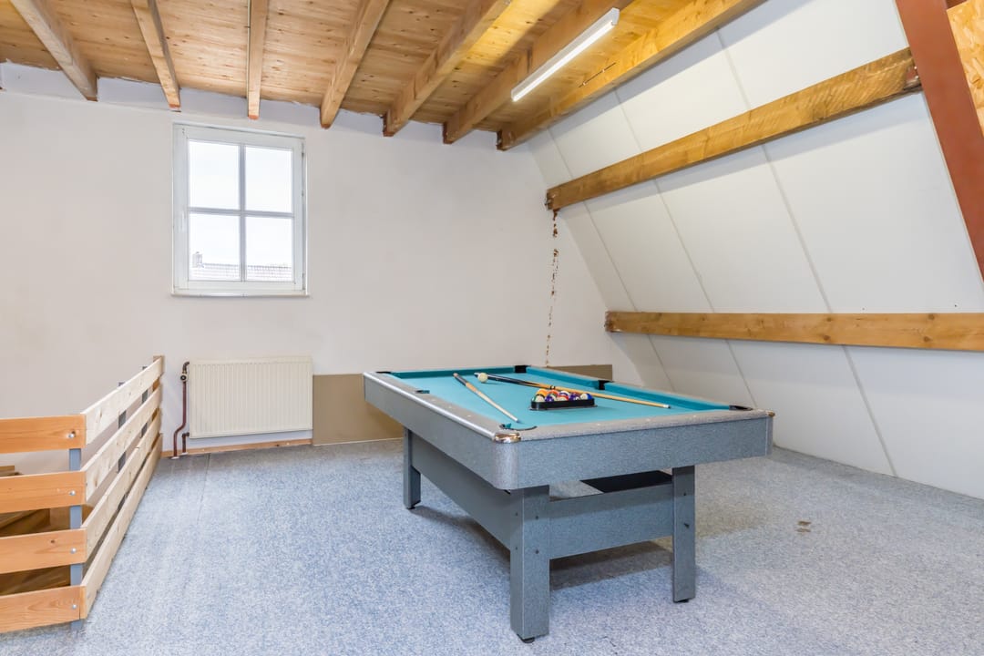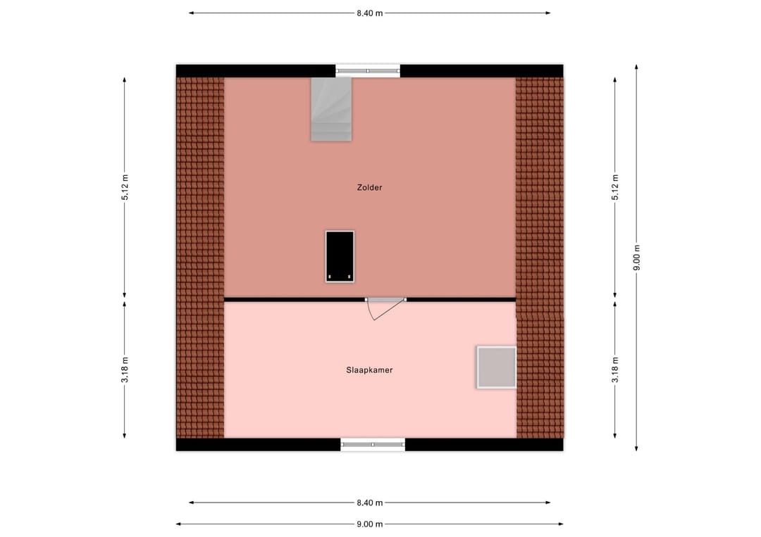 De zolderverdieping is ingedeeld in een slaapkamer (3.18 x 6.43m) met een dakraam en een grote onverdeelde ruimte die eveneens als slaap- of hobbykamer kan worden gebruikt. Er is een doorgang richting een bergvliering die middels een losse trap bereikt kan worden. Hier wordt het groteske van de woning helemaal zichtbaar door de nokhoogte van 6.80m.