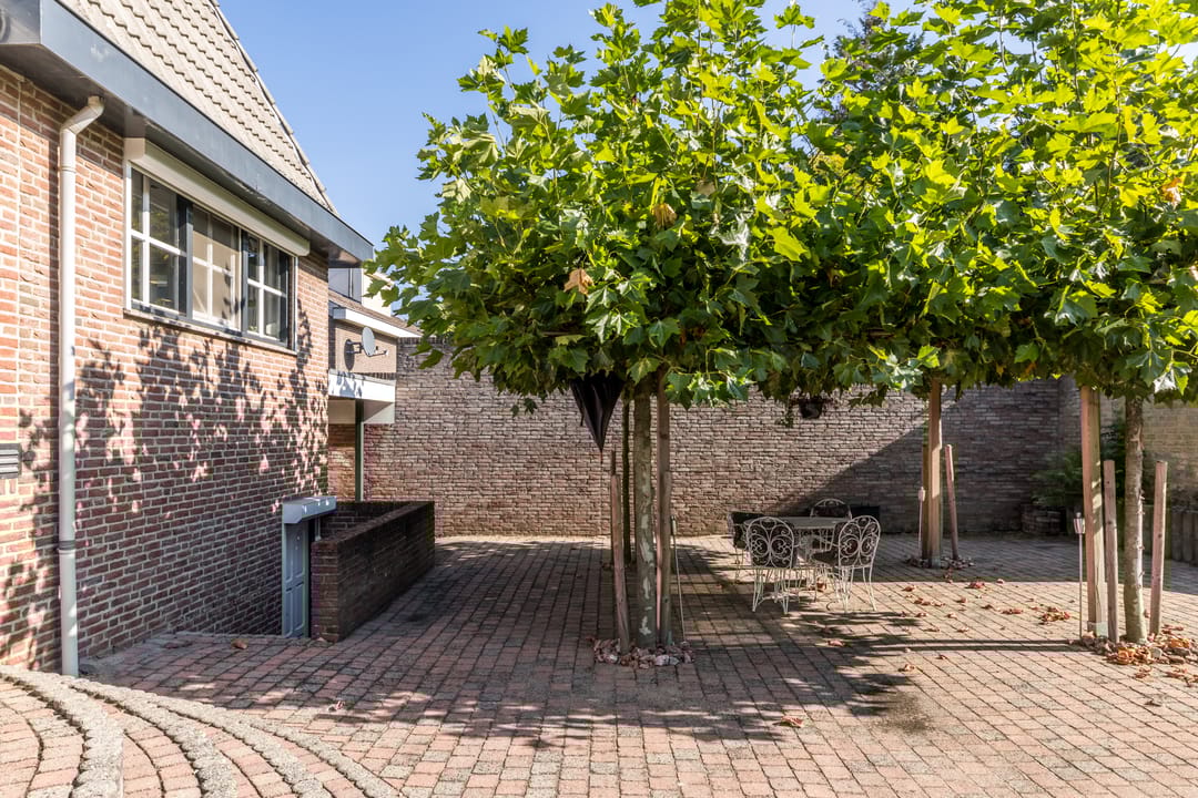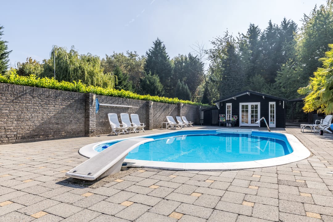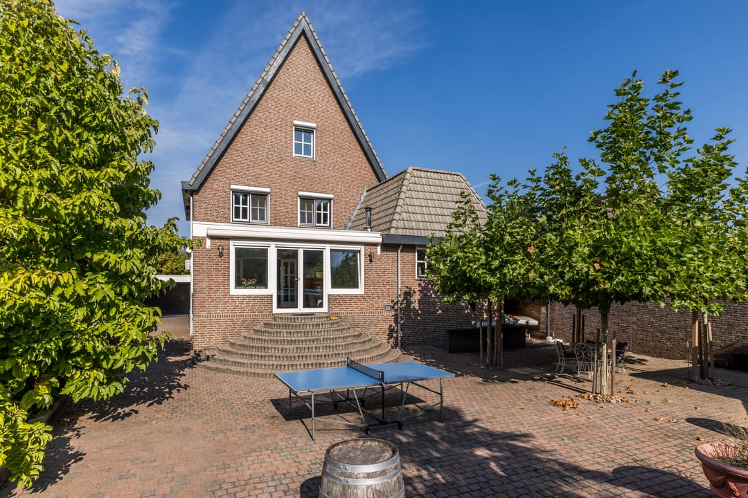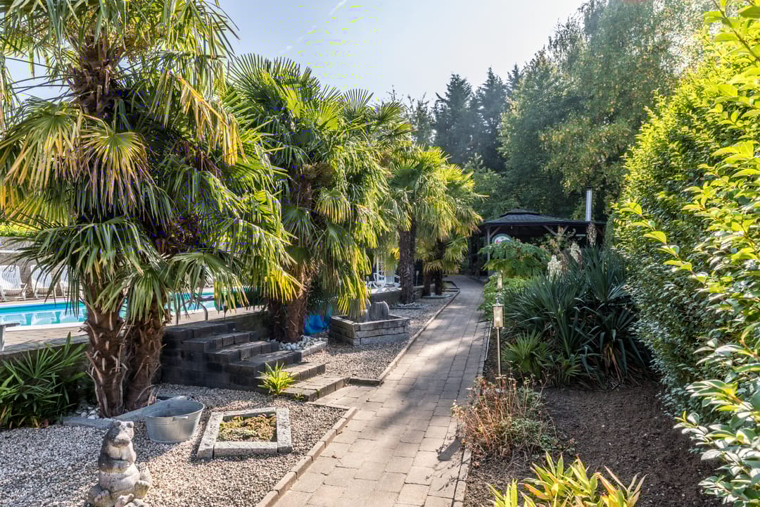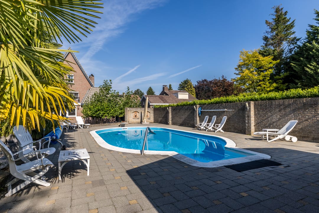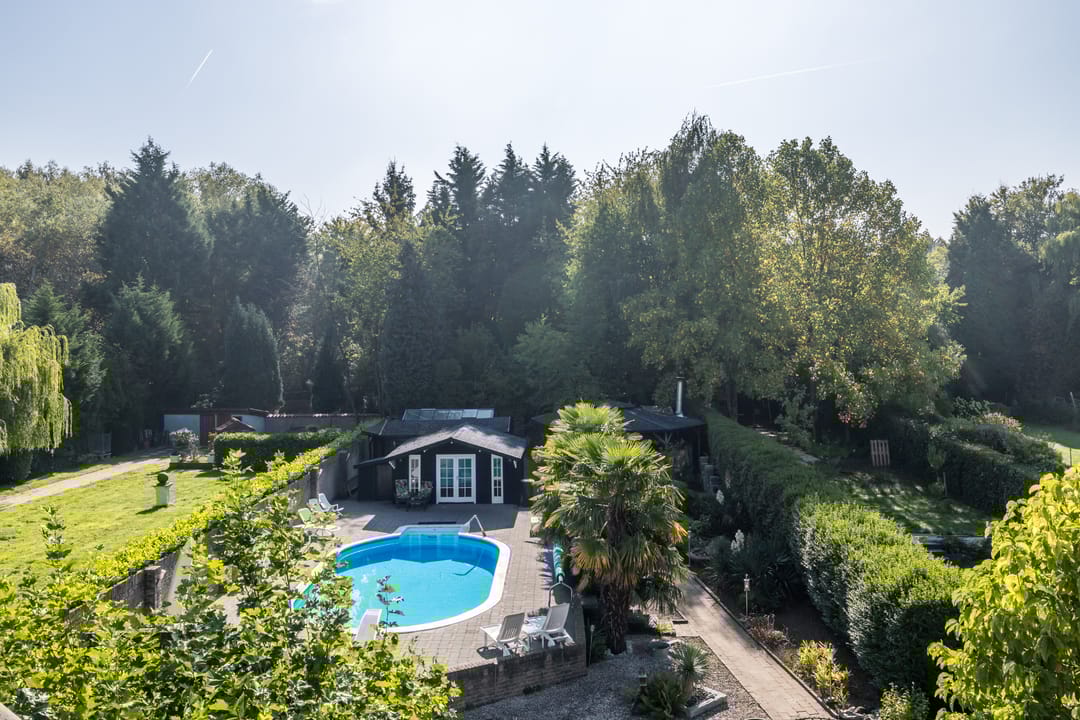 Kijkend naar de achtertuin is de conclusie gerechtvaardigd dat deze bijzonder fraai is aangelegd met het ovale zwembad, de palmbomen, een groot terras en een riant prieel. Achter het zwembad ligt de technische ruimte naast het eerste tuinhuis. Hierachter nog een tweede tuinhuis annex werkplaats van hout met een kas voor het verbouwen van eigen groente en fruit. Het bosgebied aan de achterzijde verzekert de privacy en versterkt het landelijke gevoel.