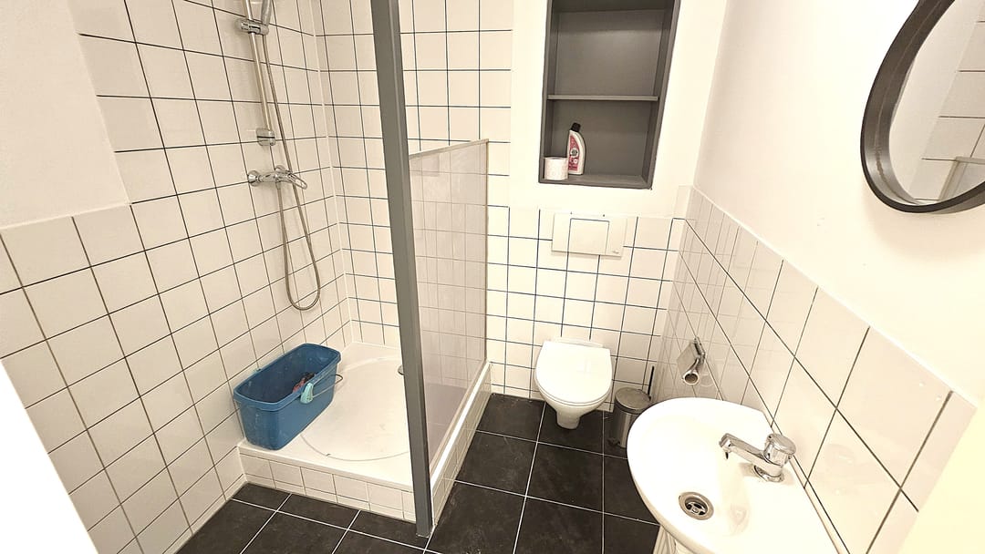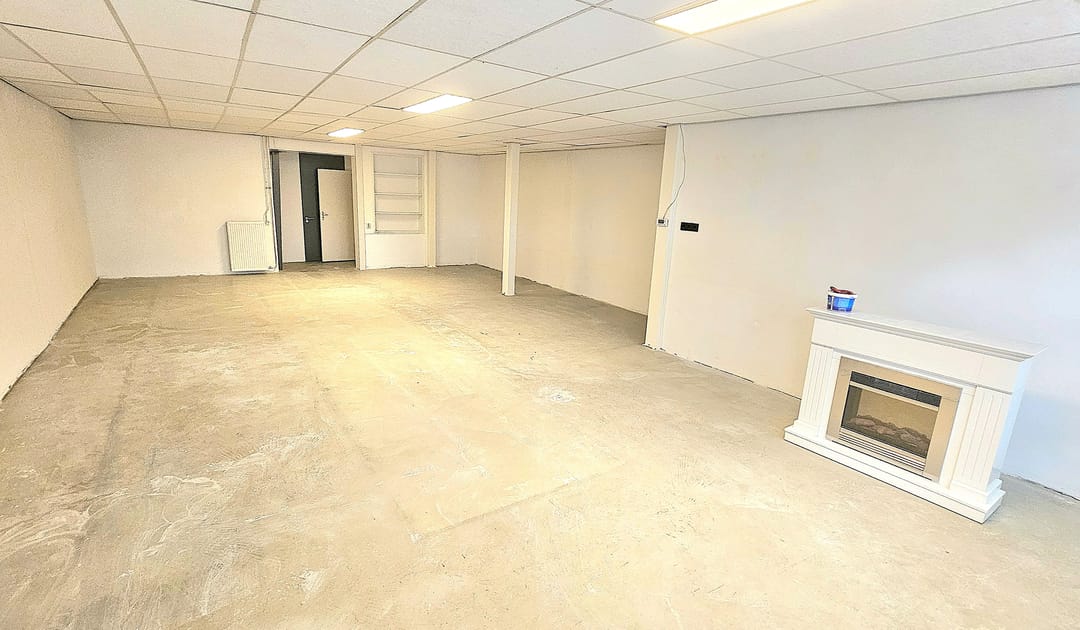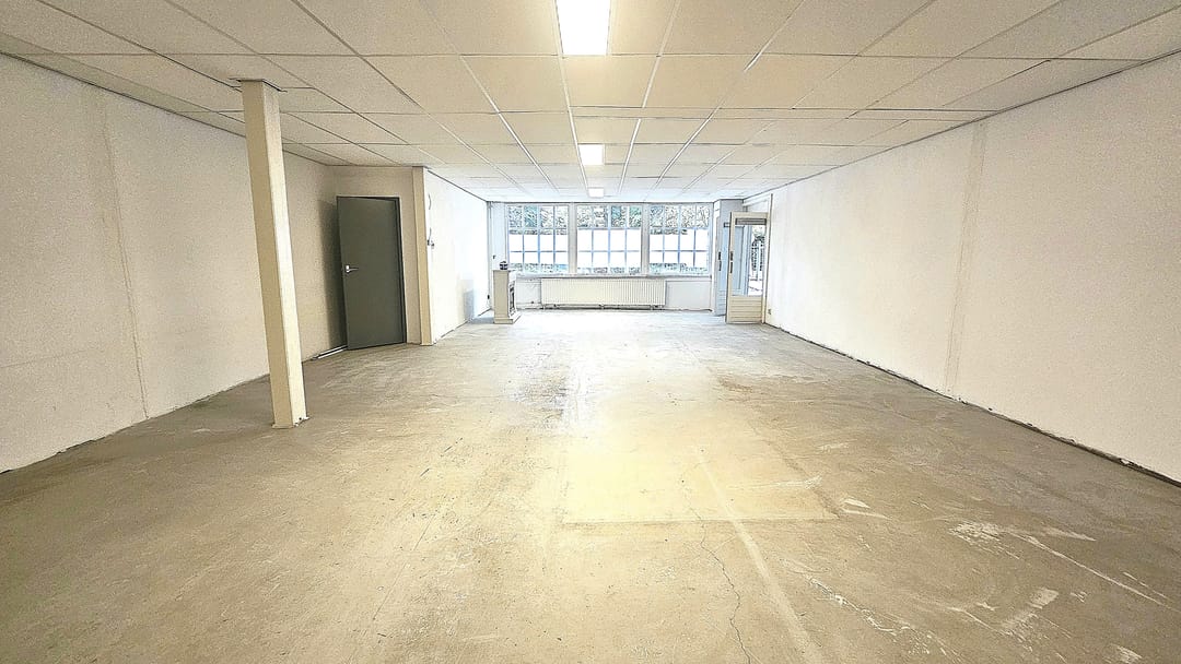 De ruime is voorzien van een vlakke betonvloer en grote raampartijen aan de voorzijde. Tevens heeft de ruimte eigen sanitair met naast de toilet ook eigen douche voorziening.