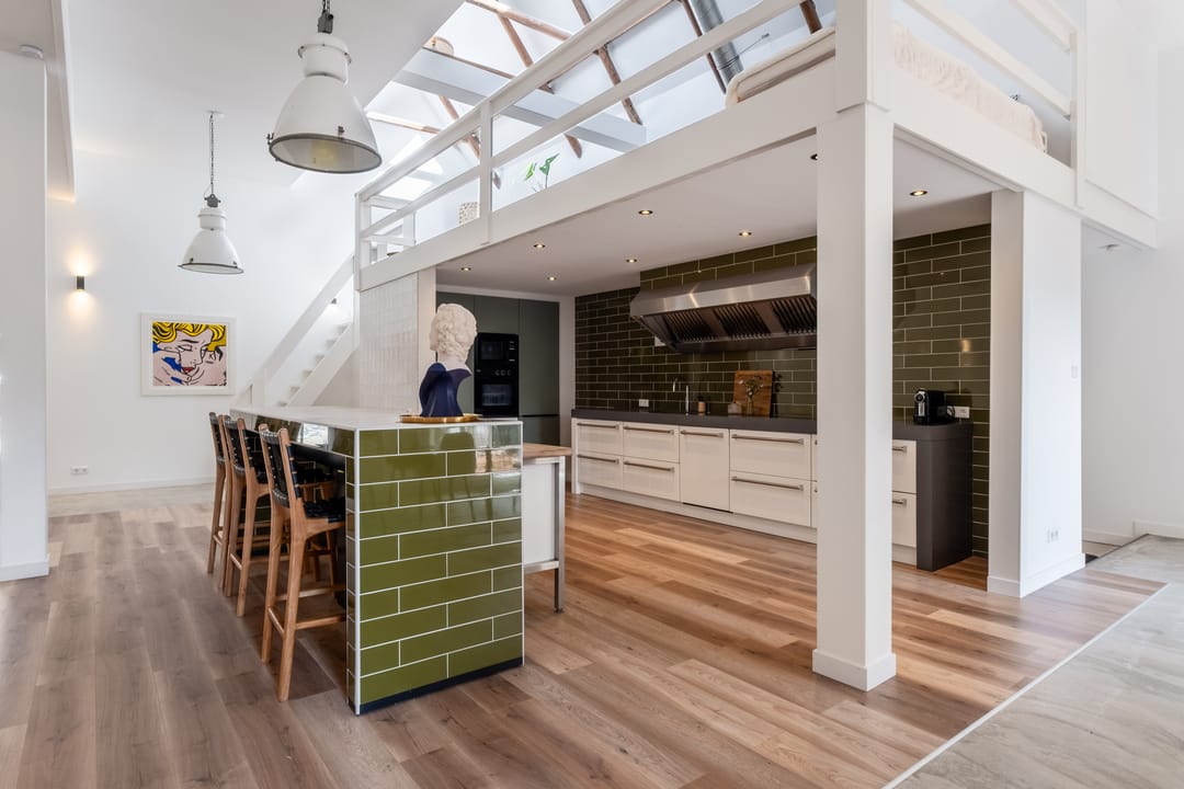 Op de eerste verdieping wacht de indrukwekkende living: een zee van licht dankzij brede raampartijen en hoge plafonds. Hier komen wonen, koken en genieten samen in een ruimte die zowel intiem als groots aanvoelt. De moderne keuken sluit naadloos aan, terwijl de aangrenzende slaapkamer met inloopkast en luxe badkamer extra comfort biedt.