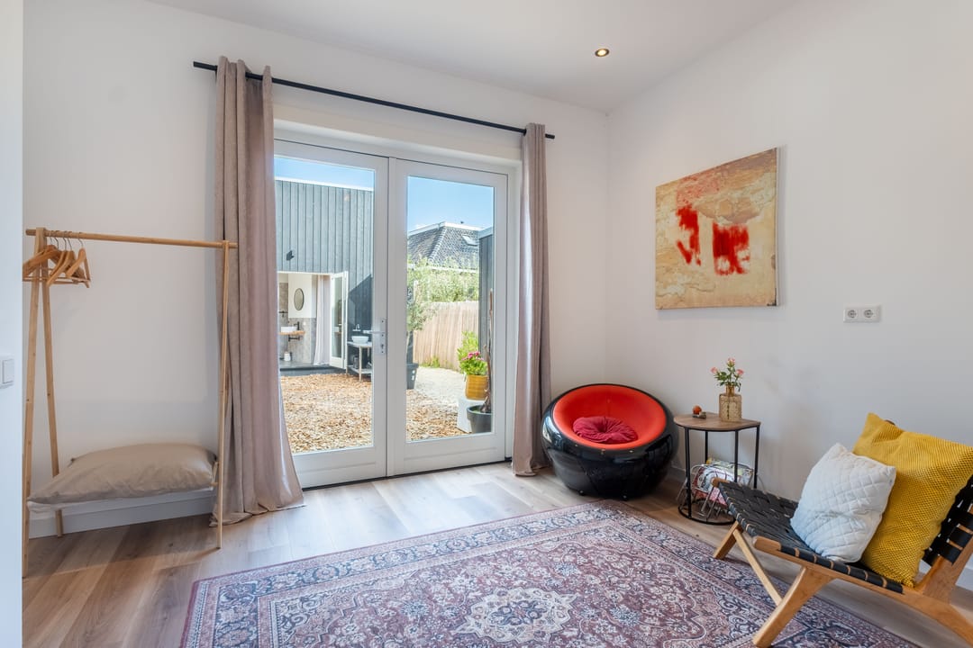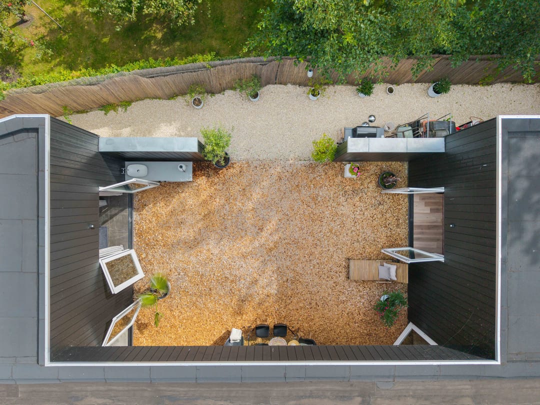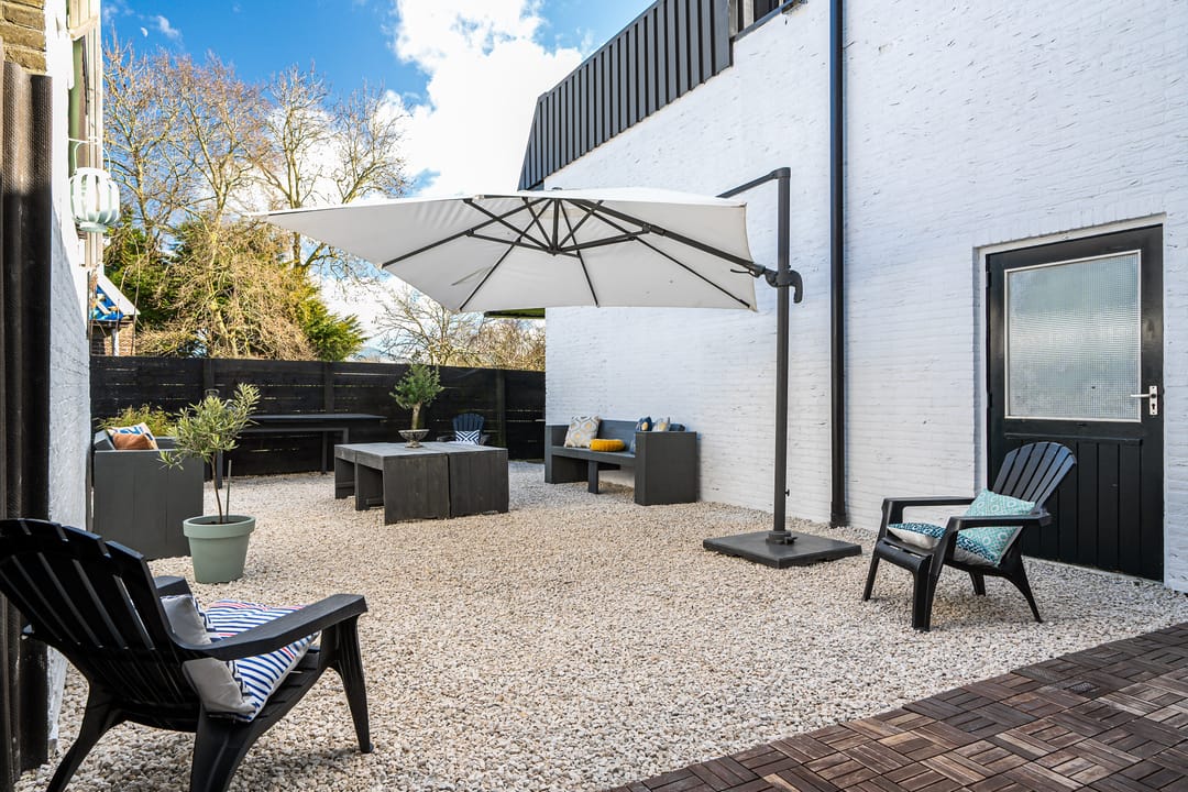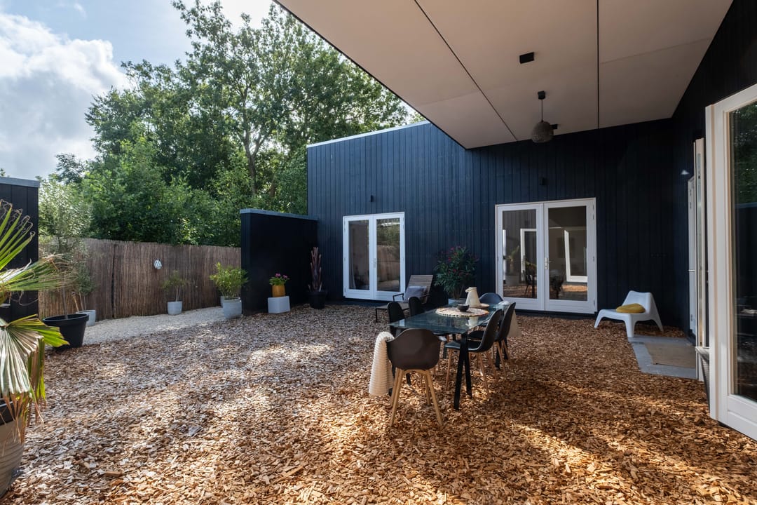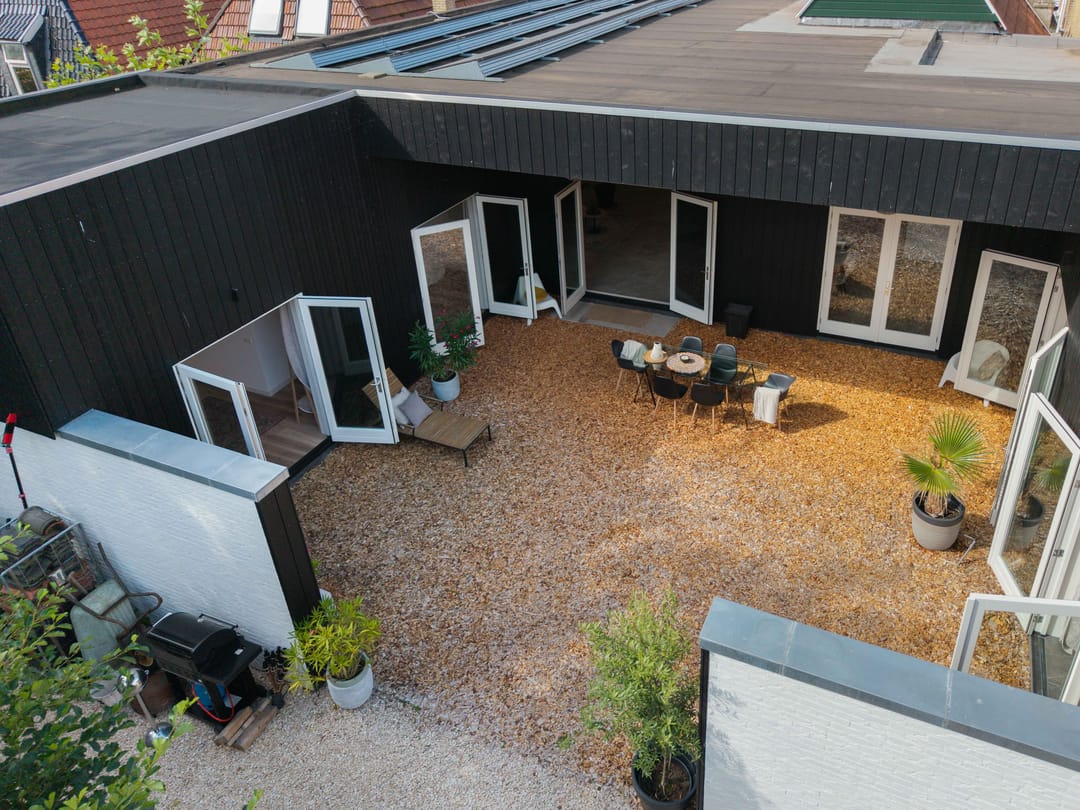 Achter het huis ligt een besloten tuin op het zuidoosten, ideaal om in alle rust van de zon te genieten. Het dakterras biedt daarnaast een extra plek om buiten te ontspannen.