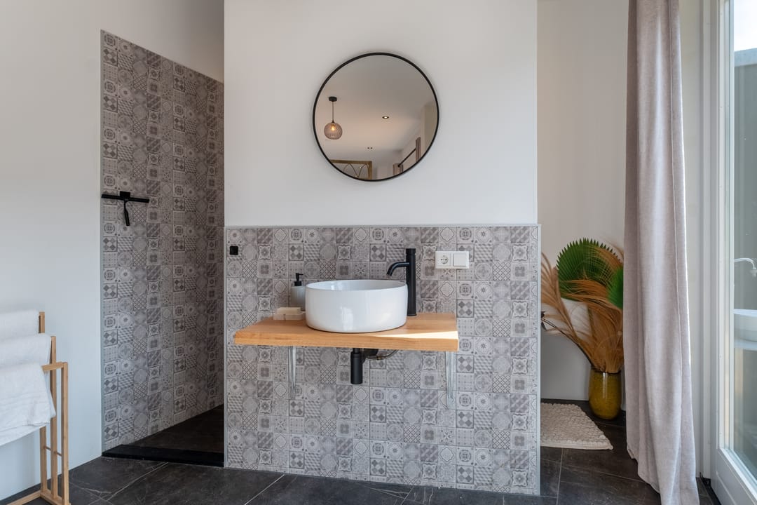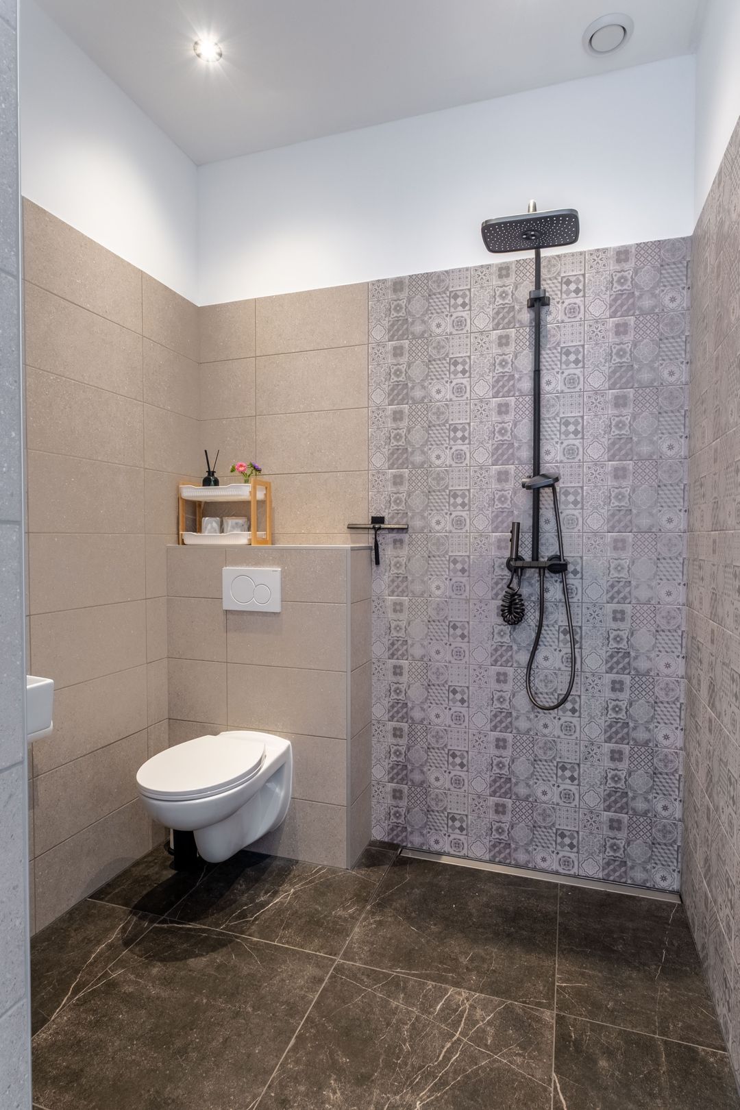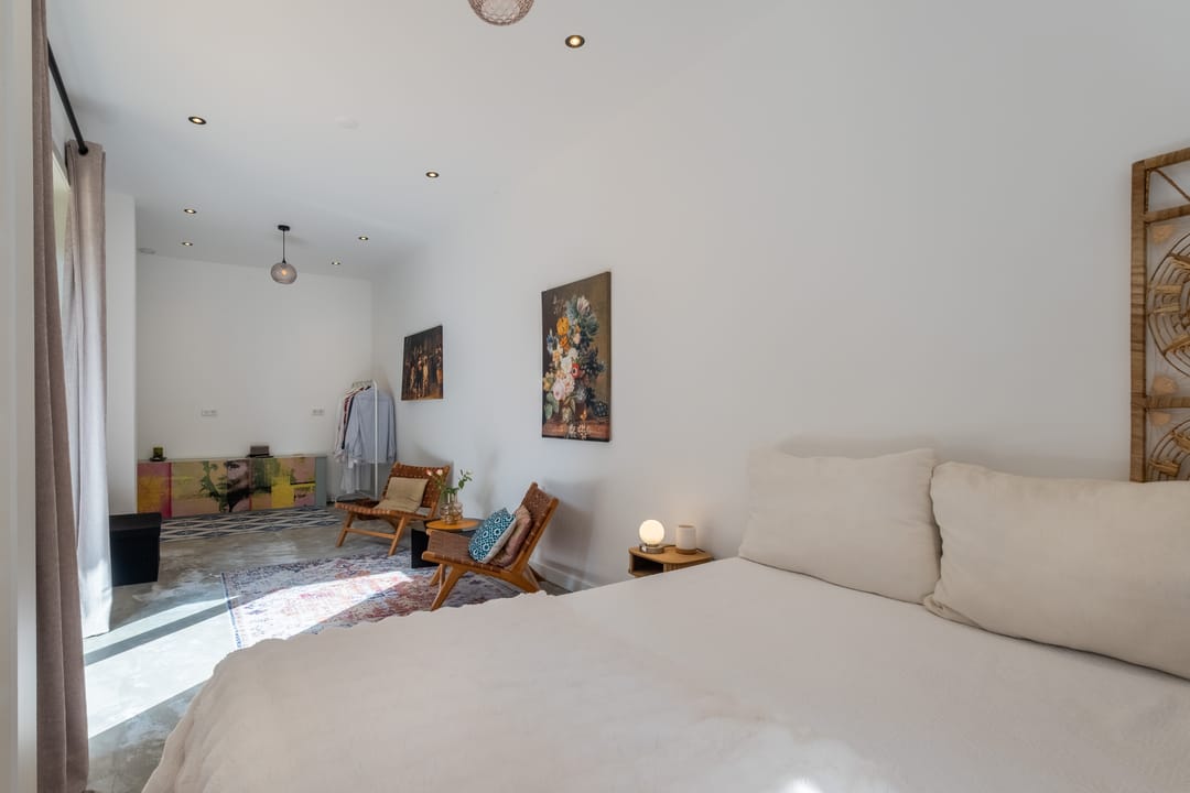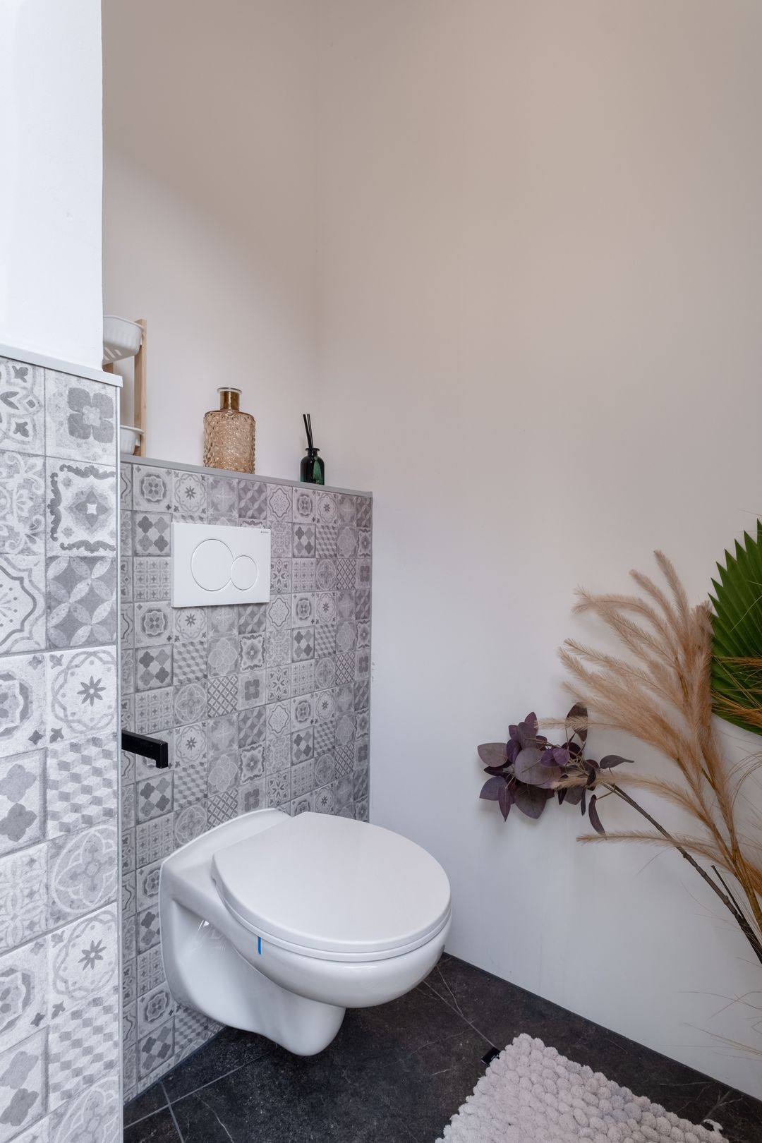 Bij binnenkomst in de hal ervaar je direct de boutique-chique uitstraling van het pand. Rechts ligt een ruime kamer die flexibel gebruikt kan worden als slaapkamer of thuiswerkkantoor. Links bevinden zich de toiletten en aparte douches.