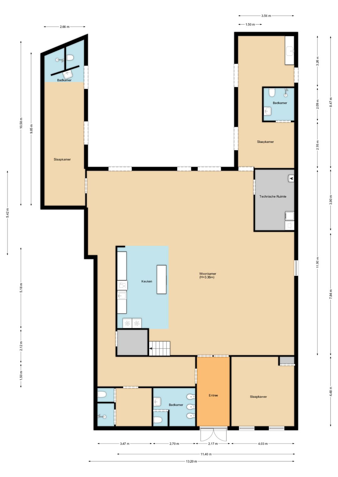 In het achterste deel van de woning zijn drie royale slaapkamers, waarvan twee zijn uitgerust met een eigen badkamer, waardoor het wonen hier bijzonder comfortabel en privé is. De indeling biedt bovendien de mogelijkheid om kamers verder op te splitsen voor extra flexibiliteit.