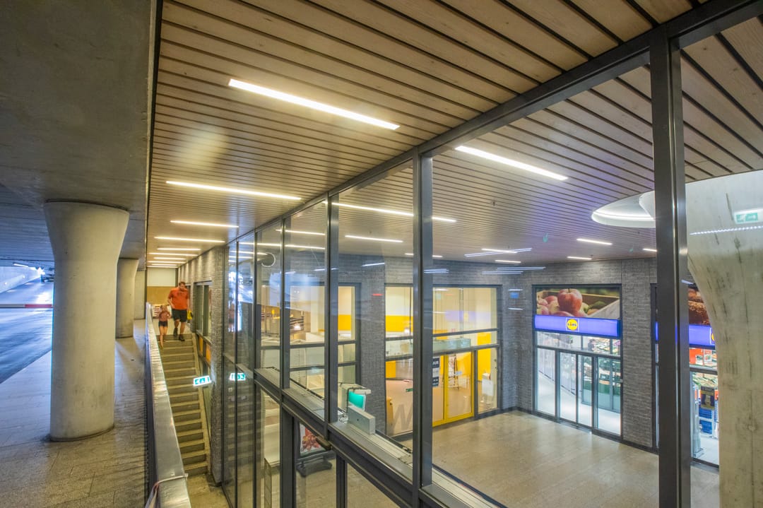 De voorzijde van beide units komen uit bij een gezamenlijk plein met de entree vanuit de parkeergarage en de roltrap naar boven.