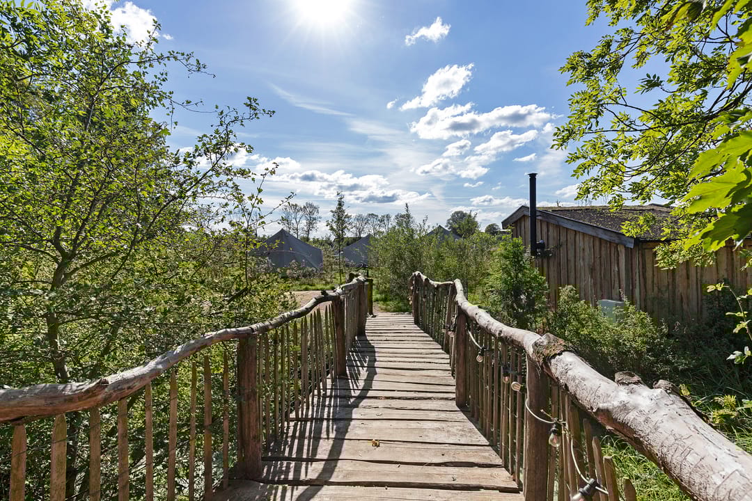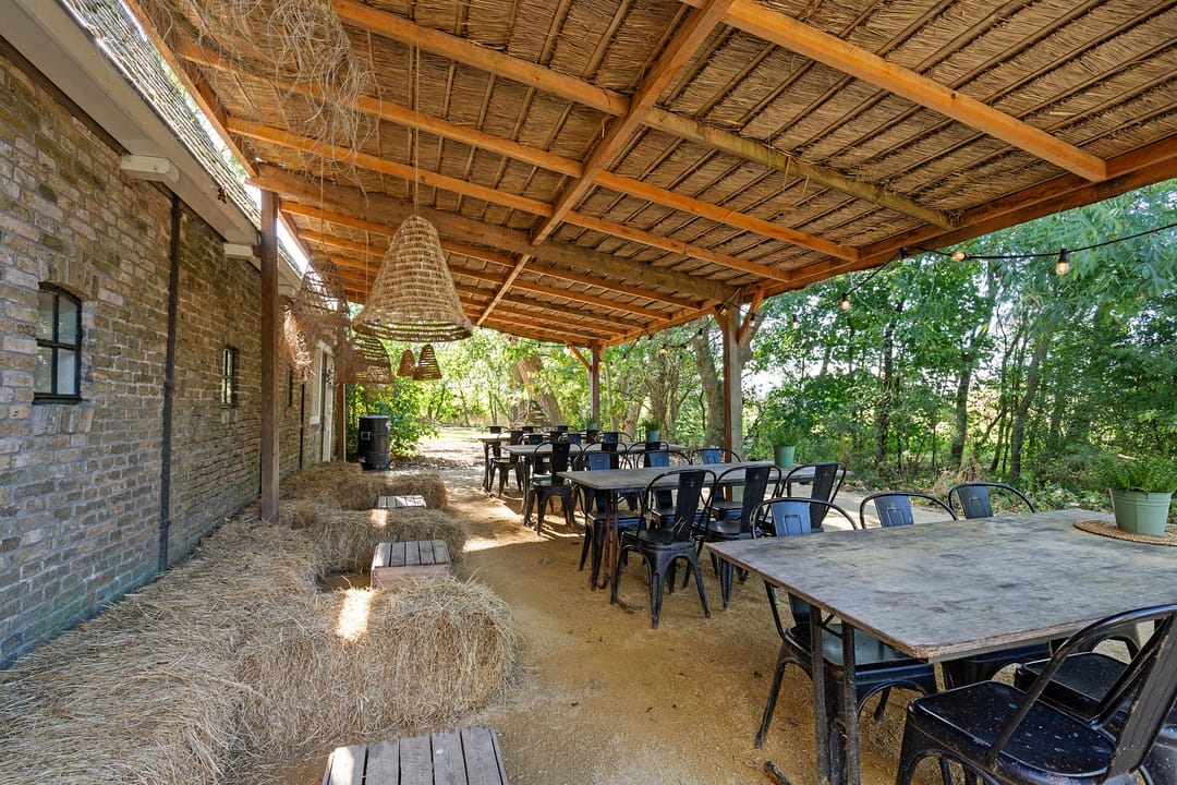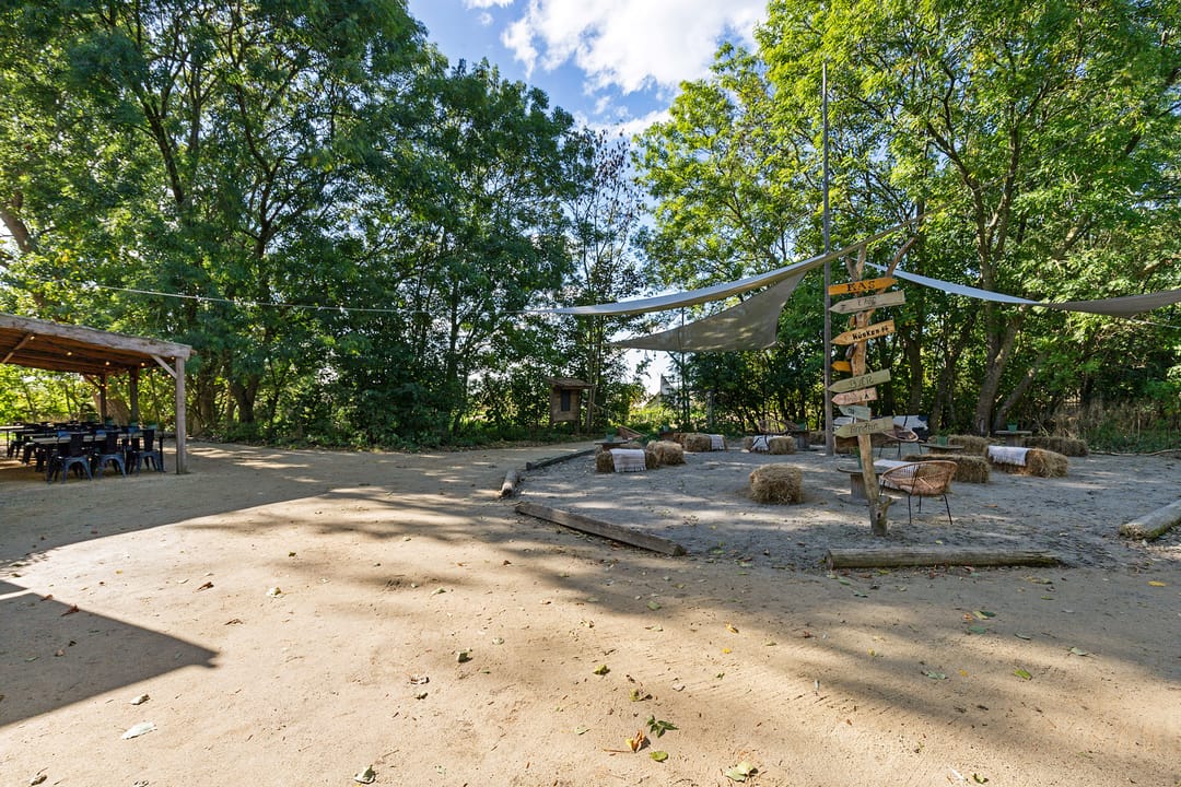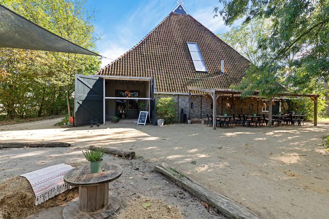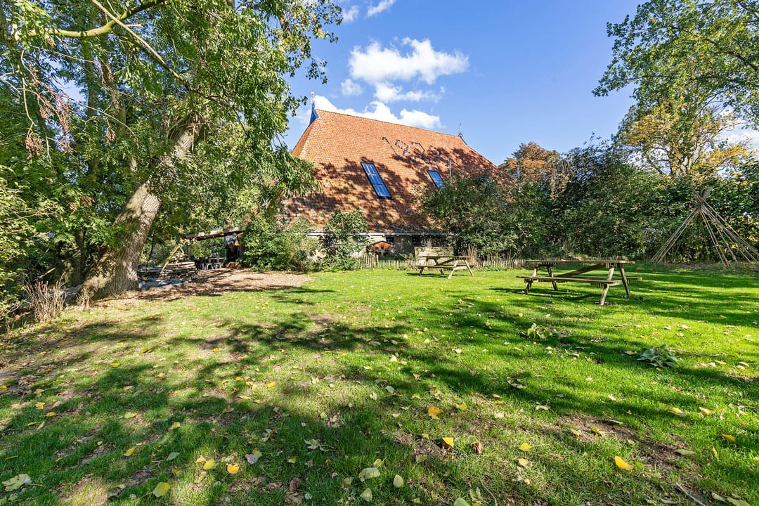 Achter de boerderij ontvouwt zich een verrassend terrein met o.a. een mini-camping (ca. 20 plaatsen), vier natuurhuisjes, een grote glazen kas die dienst doet als moestuin én trouwlocatie, een royale schuur, een windmolen en uitgestrekte landbouwgrond.