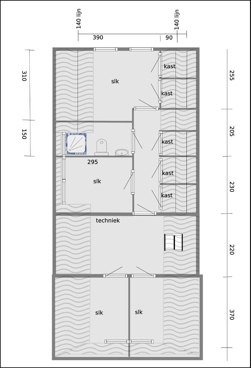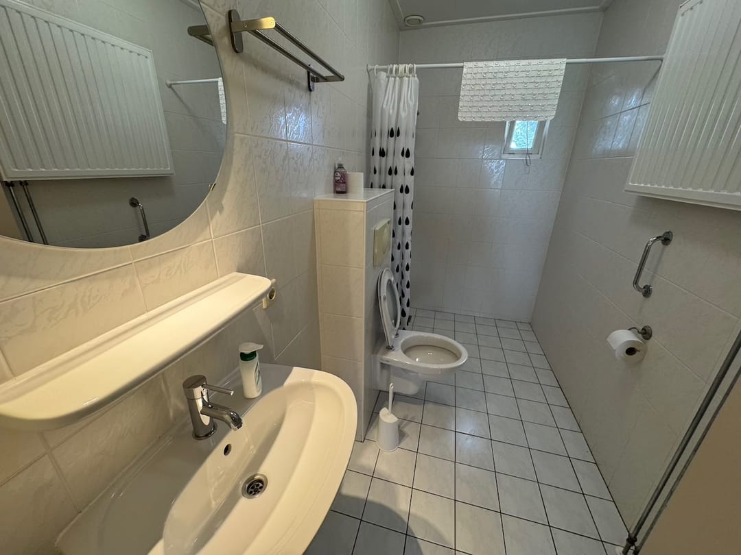 Overloop, 4 slaapkamers, badkamer (douche, toilet en wastafel) en berging (technische ruimte)