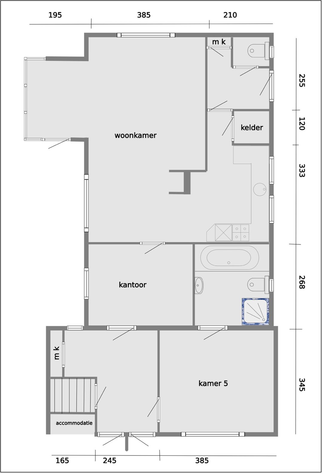 Een vrijstaande woning met kantoorruimte en een slaapkamer met badkamer (slaapkamer 5 van de groepsaccommodatie) op de begane grond en op de verdieping o.a. 4 slaapkamers en een badkamer;