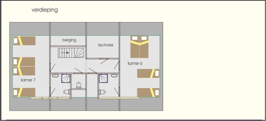 Aantal kamers/bedden: 6-7 kamers, met 18-21 bedden. Alle kamers zijn voorzien van eigen sanitair (douche, toilet en wastafel). Er is een luxe kamer tweepersoons kamer op de begane grond, die niet standaard bij de verhuur van de groepsaccommodatie inbegrepen is, maar desgewenst er extra bij kan worden gehuurd. Vandaar dat er in principe sprake is van 6 kamers en dus eventueel een 7e die ook voor de woning gebruikt kan worden.