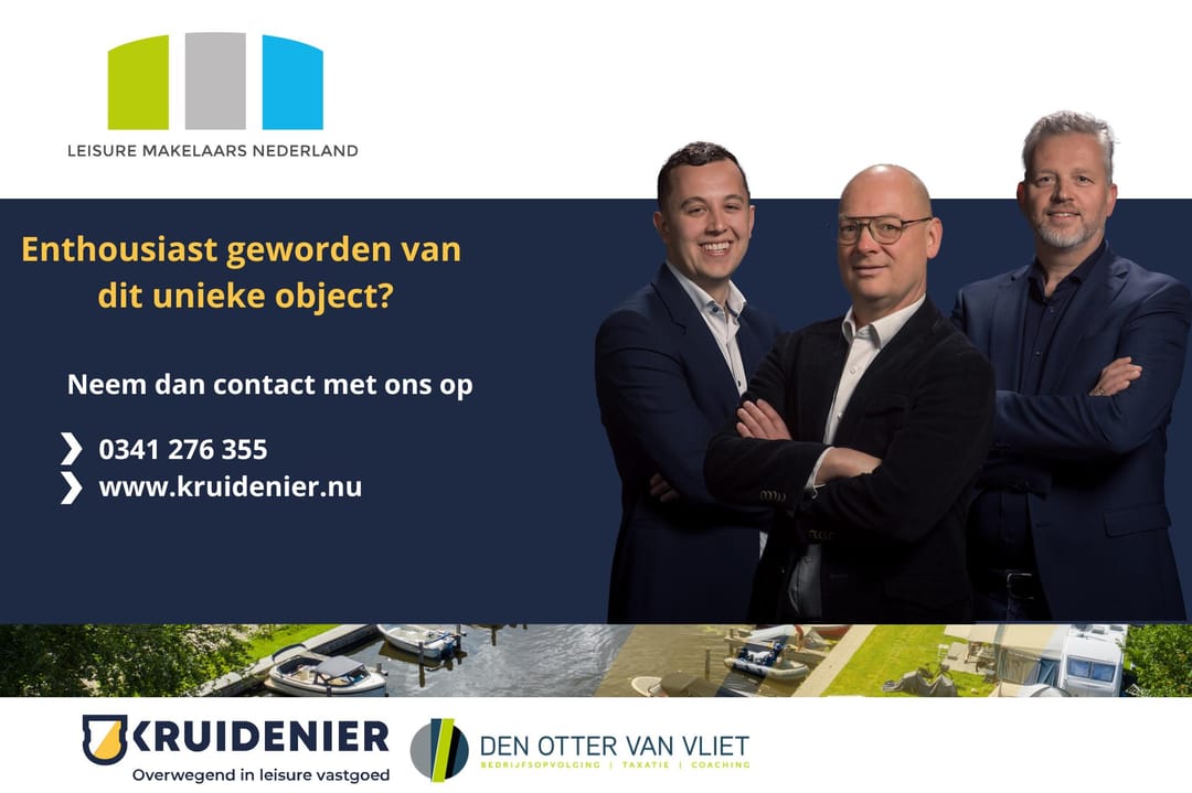 Deze informatie is geheel vrijblijvend, uitsluitend bestemd voor geadresseerde en niet bedoeld als een aanbod. Ten aanzien van de juistheid kan door Kruidenier Recreatie Bedrijfsmakelaardij B.V. doch door Den Otter van Vliet B.V. geen aansprakelijkheid worden aanvaard, noch kan aan de vermelde informatie enig recht worden ontleend. Alle opgegeven aantallen, maten en oppervlakten zijn indicatief.