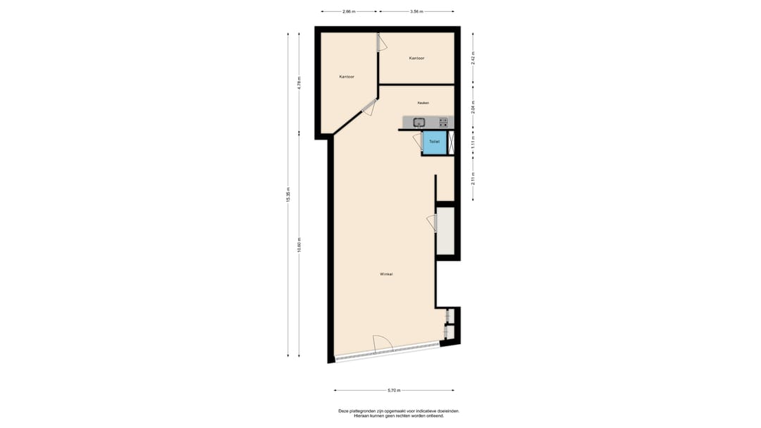 Middels centrale entree met overkapping toegang tot de winkelruimte. Aan de achterzijde van de winkel is een magazijnruimte met pantry en toilet.