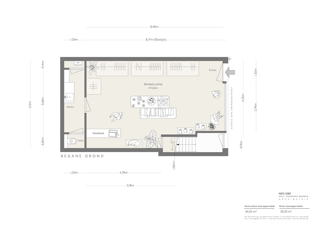 De grote raampartijen aan de voorzijde zorgen voor een prettige hoeveelheid daglicht en uitstekende zichtbaarheid. Met een frontbreedte van 4,3 meter biedt dit ondernemers de ideale mogelijkheid om hier producten optimaal te presenteren.