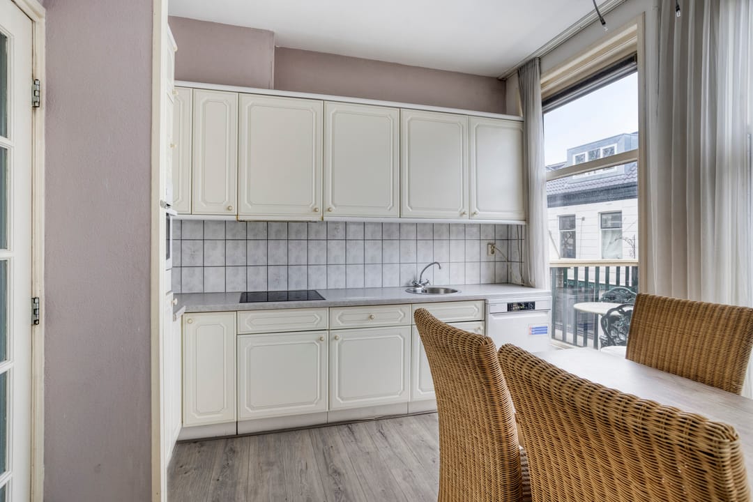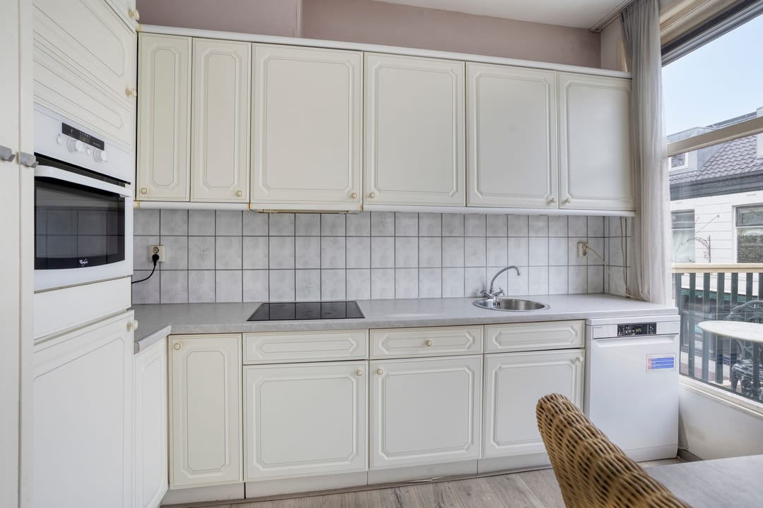 Overloop / hal met toegang tot het toilet en een ruime woonkamer met een nette open keuken voorzien van diverse inbouwapparatuur. De woonkamer heeft veel lichtinval en vanuit de open keuken is een balkon van 11 m2 aan de voorzijde van het pand te bereiken. Vanaf het balkon is het genieten van de reuring in de Rolderstraat.