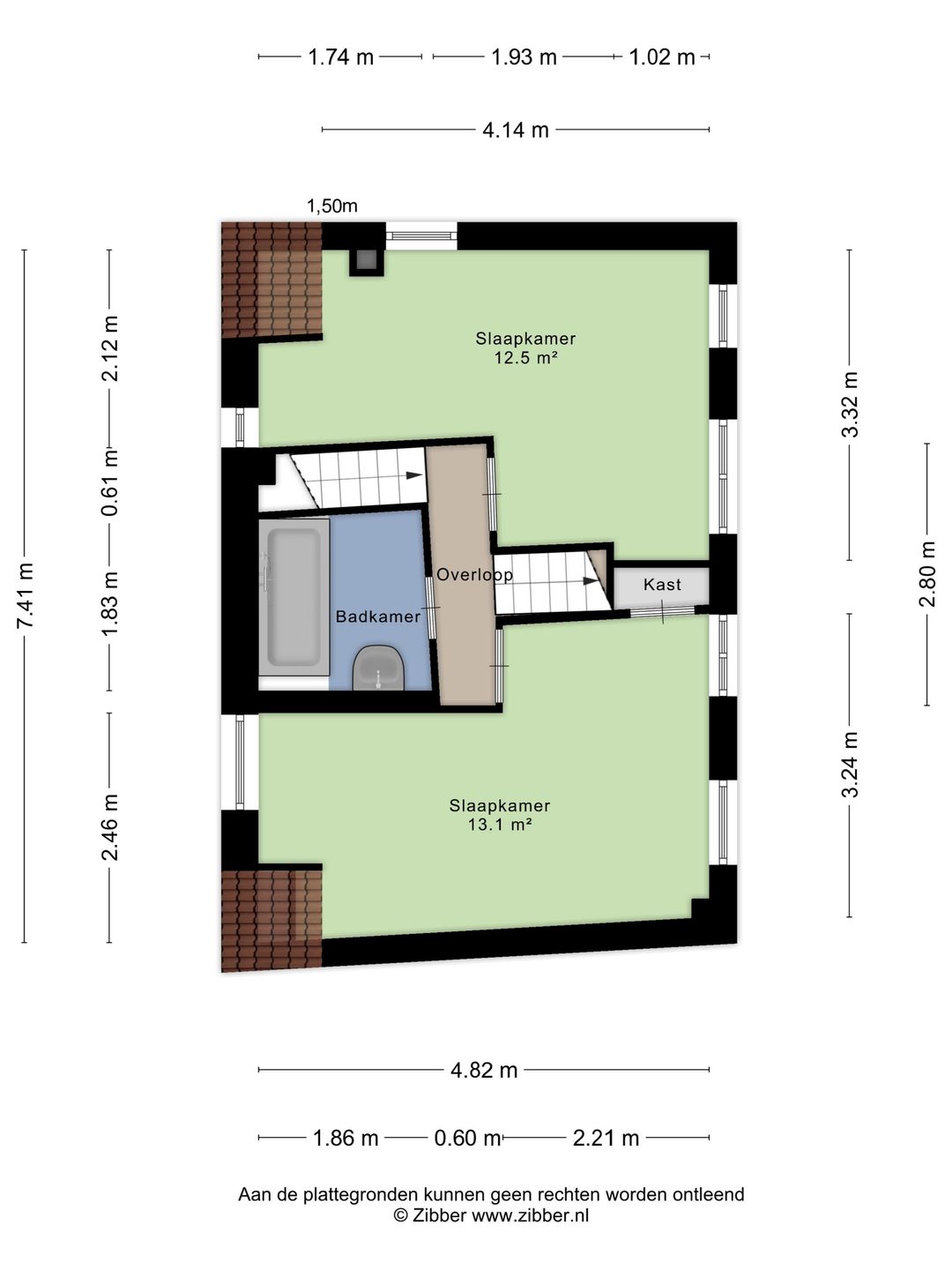 Op deze verdieping bevinden zich twee slaapkamers en de badkamer. De badkamer is uitgerust met een ligbad en een wastafelmeubel.