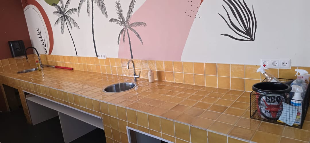 - Gemetseld en betegeld aanrecht met aan- en toebehoren;