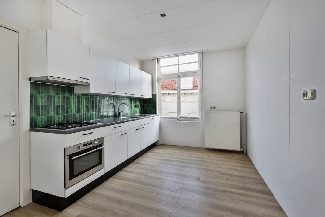 Op de eerste verdieping bevinden zich een bijkeuken, een functionele keuken en een ruime, lichte woonkamer met uitzicht over het stadscentrum. De badkamer is voorzien van een douche, ligbad en wastafel.