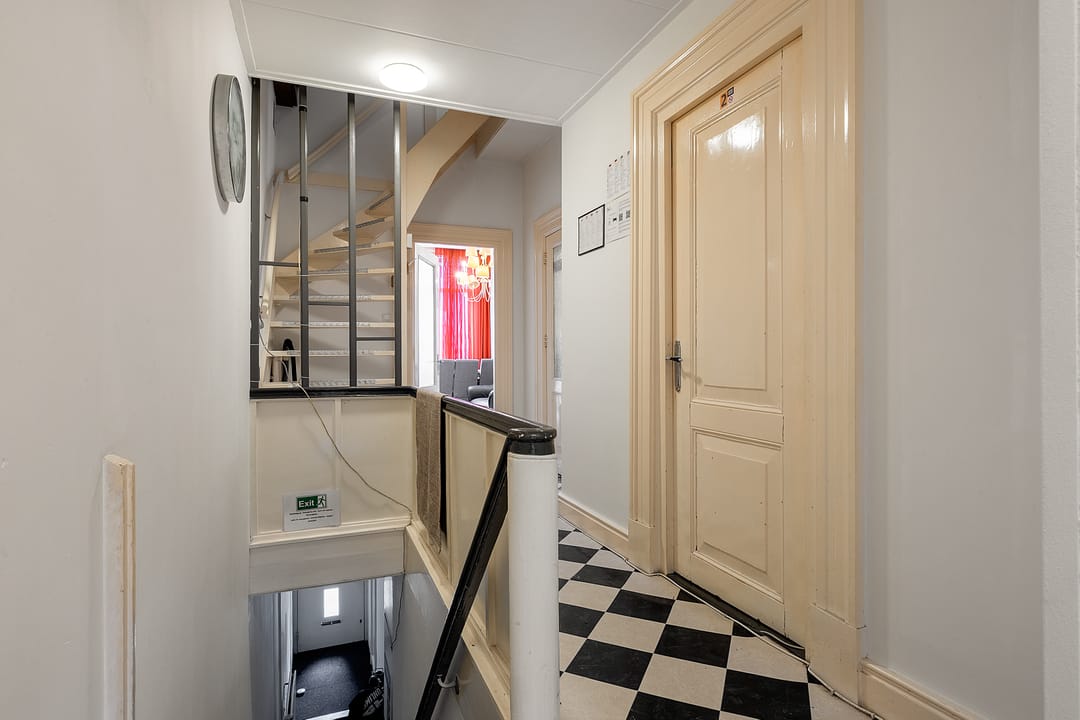entree via portaal, trap naar 1e verdieping: overloop, toilet, woonkamer, 2 slaapkamers de slaapkamer aan de voorzijde is gemaakt met een prefab wand de wand kan makkelijk verwijderd worden en dan creëer je weer de oorspronkelijke woonkamer, badkamer met ligbad, inloopdouche en vaste wastafel, uitgebouwde keuken met diverse inbouwapparatuur en deur naar plat dak, vaste trap naar: