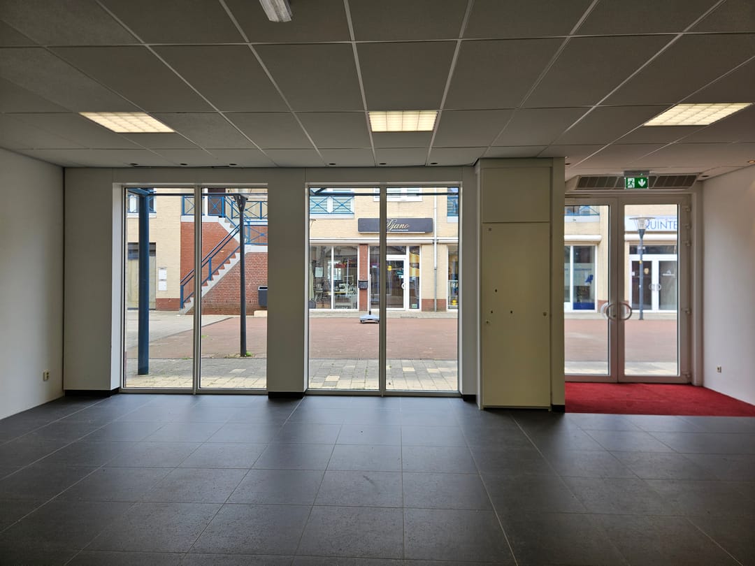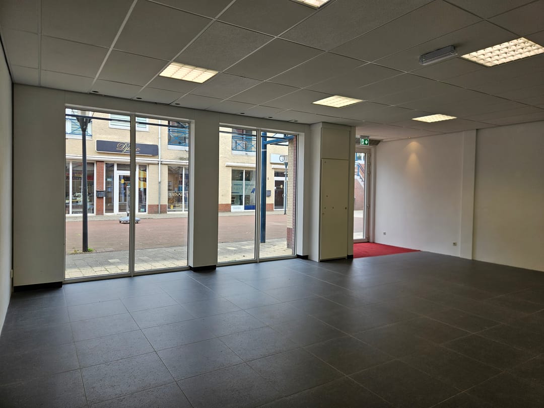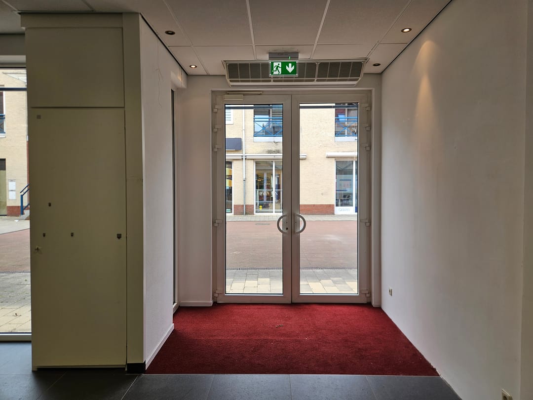De voorzijde van de winkel is voorzien van een aluminium pui met glas tot aan de vloer.