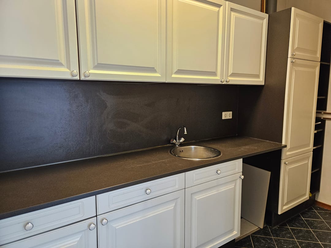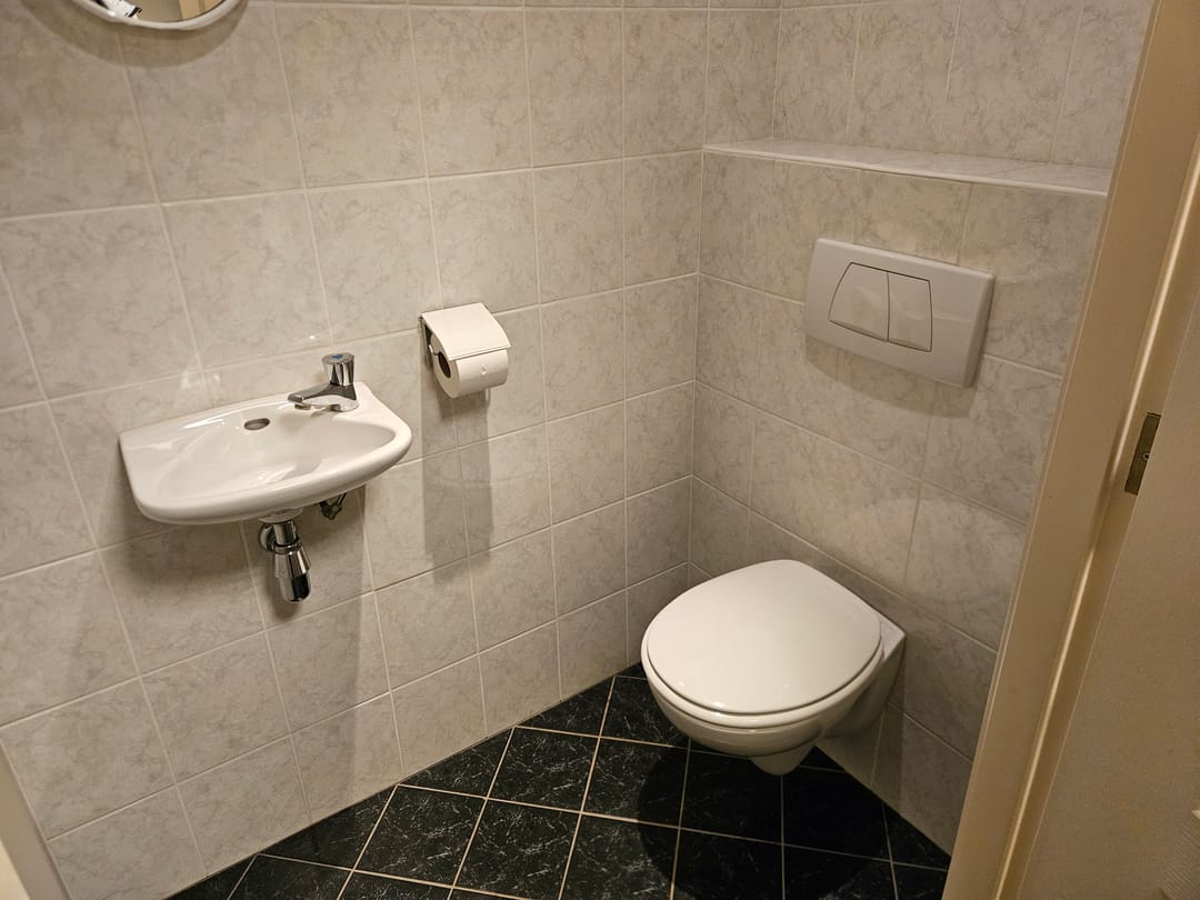 Achterin de winkel is een keukenruimte met aanrecht en een geheel betegeld toilet met fonteintje en opstelling van de c.v. combi-ketel.