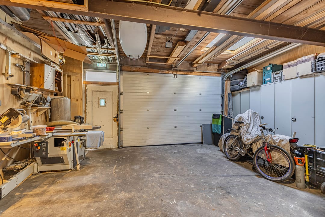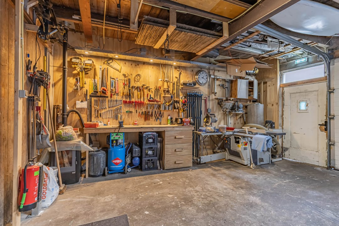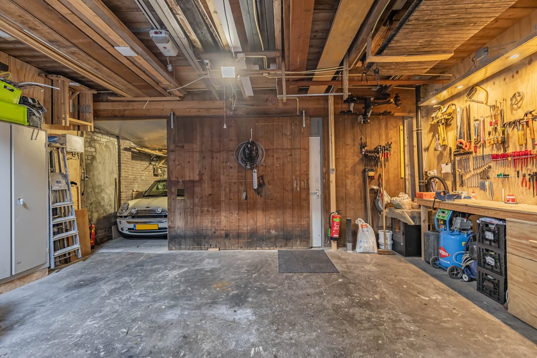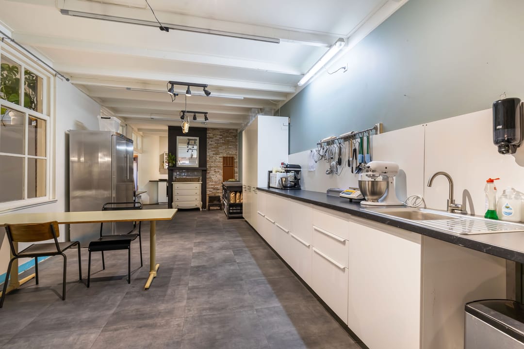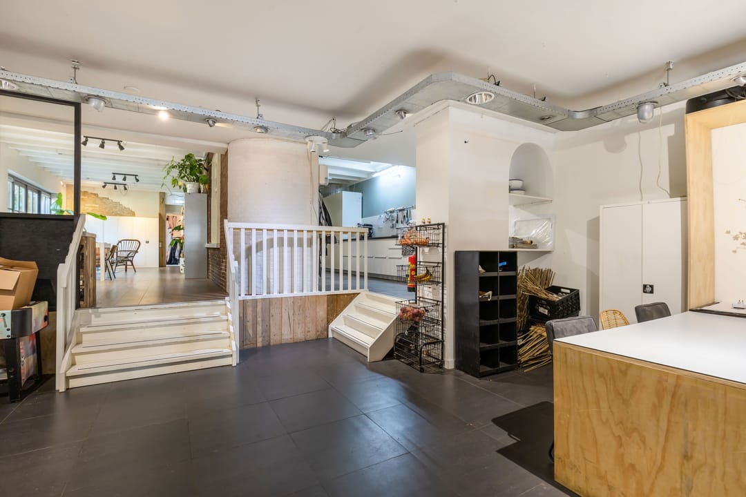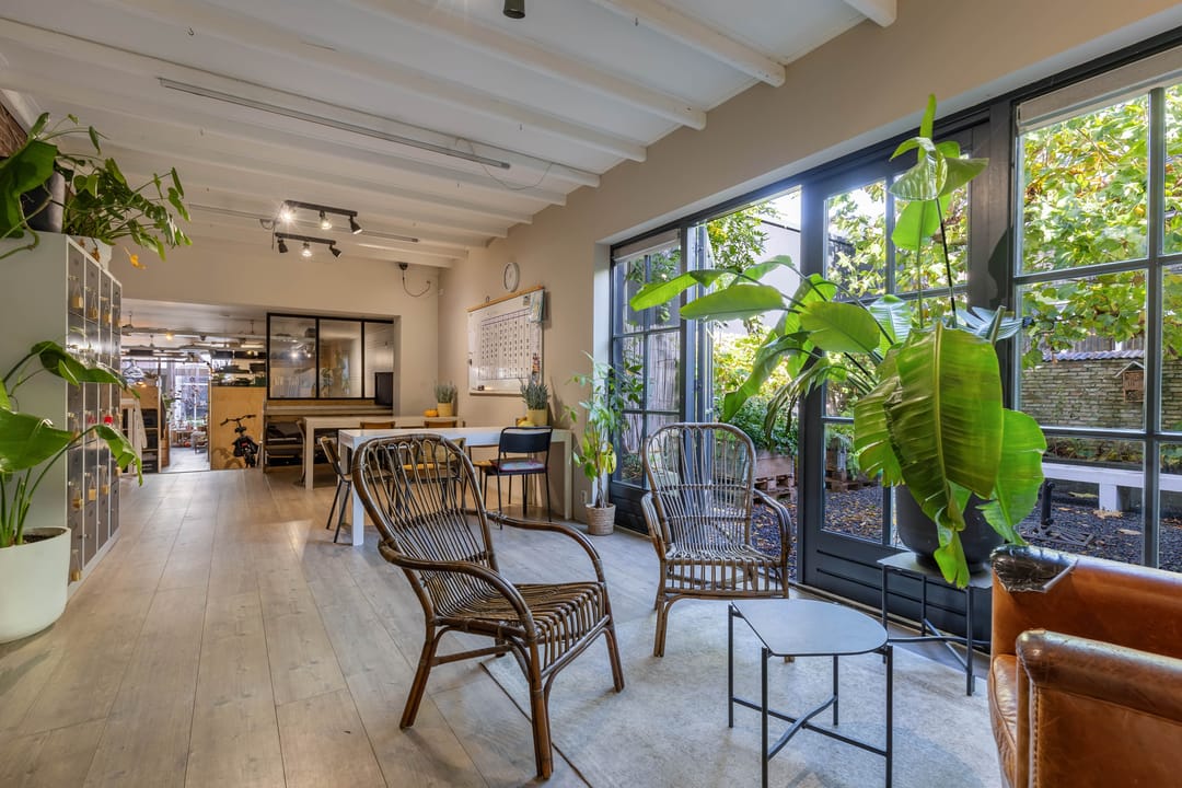 De ruimte is verdeeld in verschillende zones, waaronder een werkruimte met keuken, een loungegedeelte aan de patio en een achtergelegen garage met eigen toegang.