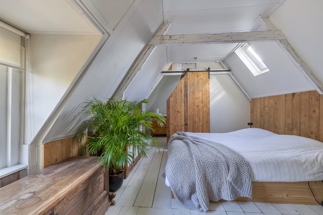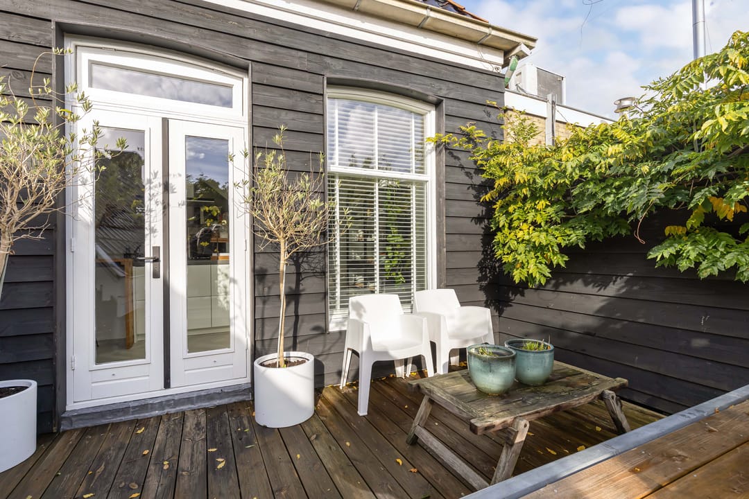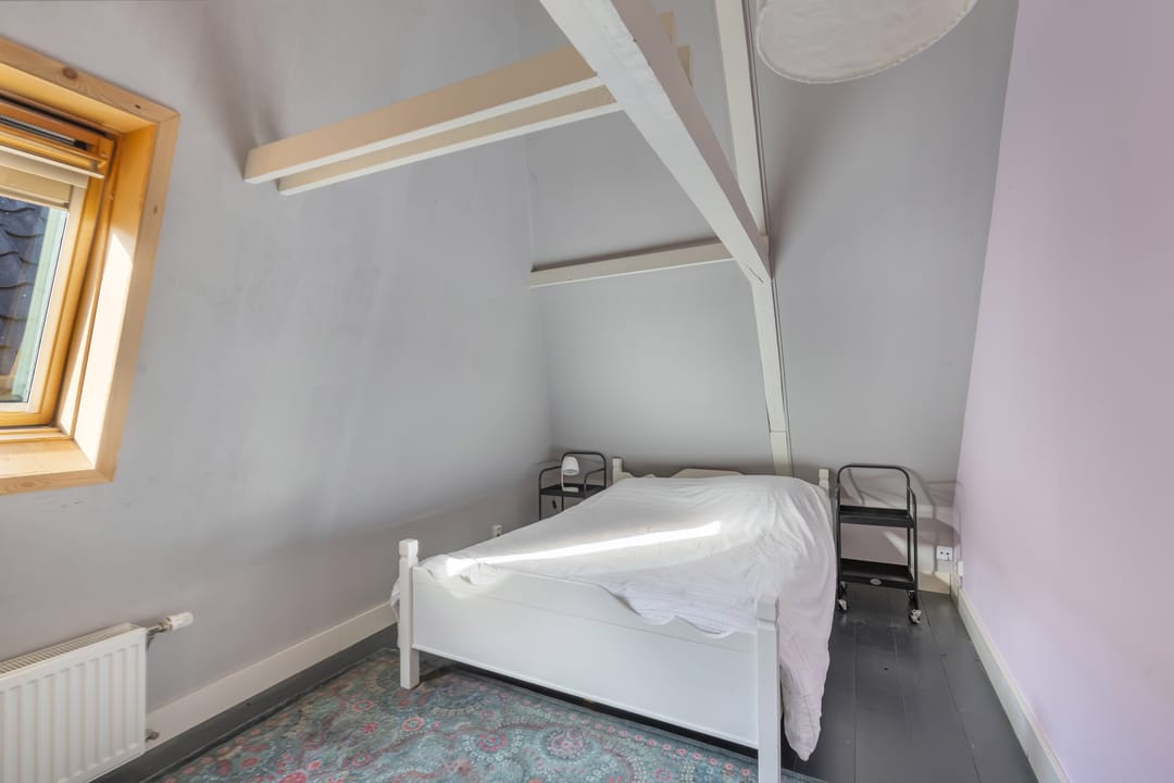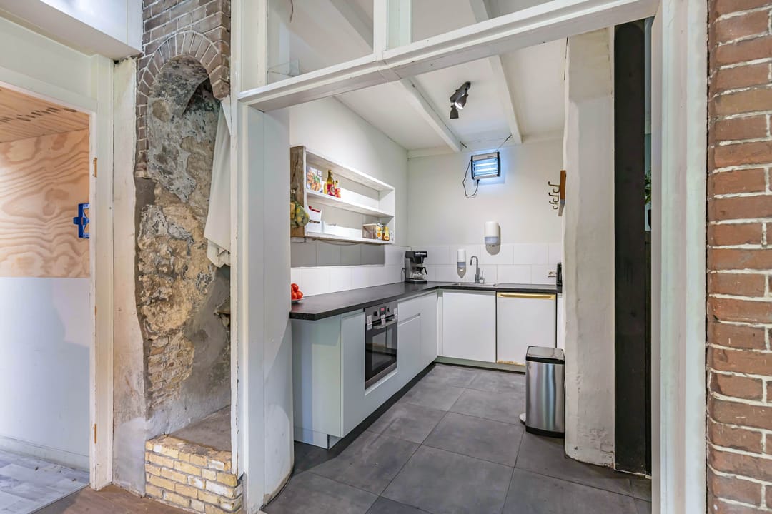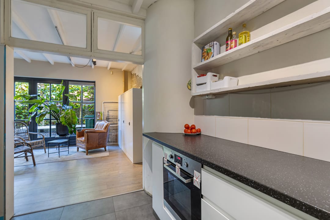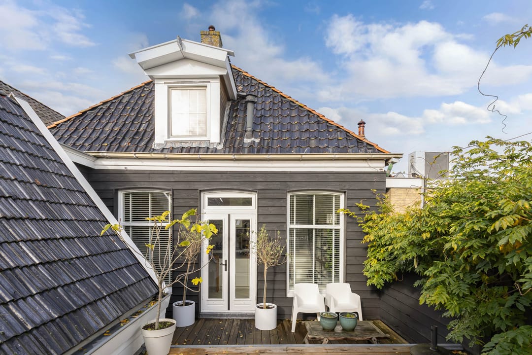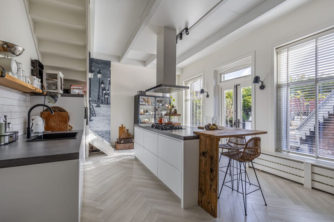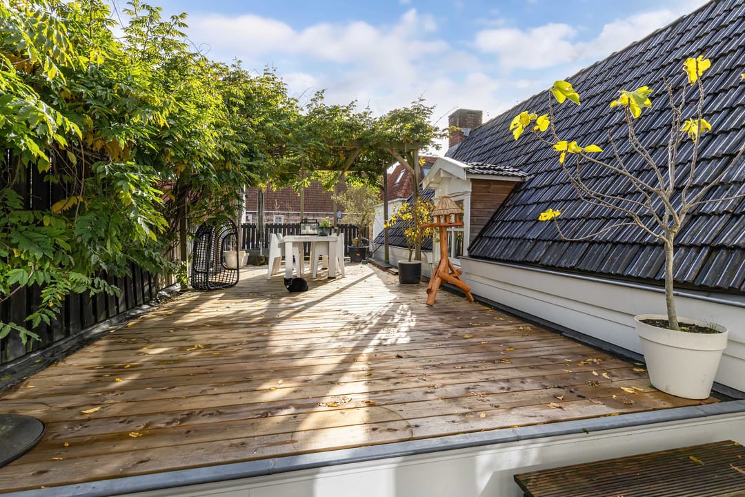 De woonkamer is licht en ruim, met 4 grote ramen, originele houten plafonds en stijlvolle kleuren. De moderne keuken met kookeiland en inbouwapparatuur vormt het hart van de woning. Via openslaande deuren stap je zo op het zonnige dakterras op – een heerlijke plek om te ontspannen. Vanuit de keuken bereik je de wasruimte en een royale slaapkamer met eigen badkamer, voorzien van douche en wastafel.
