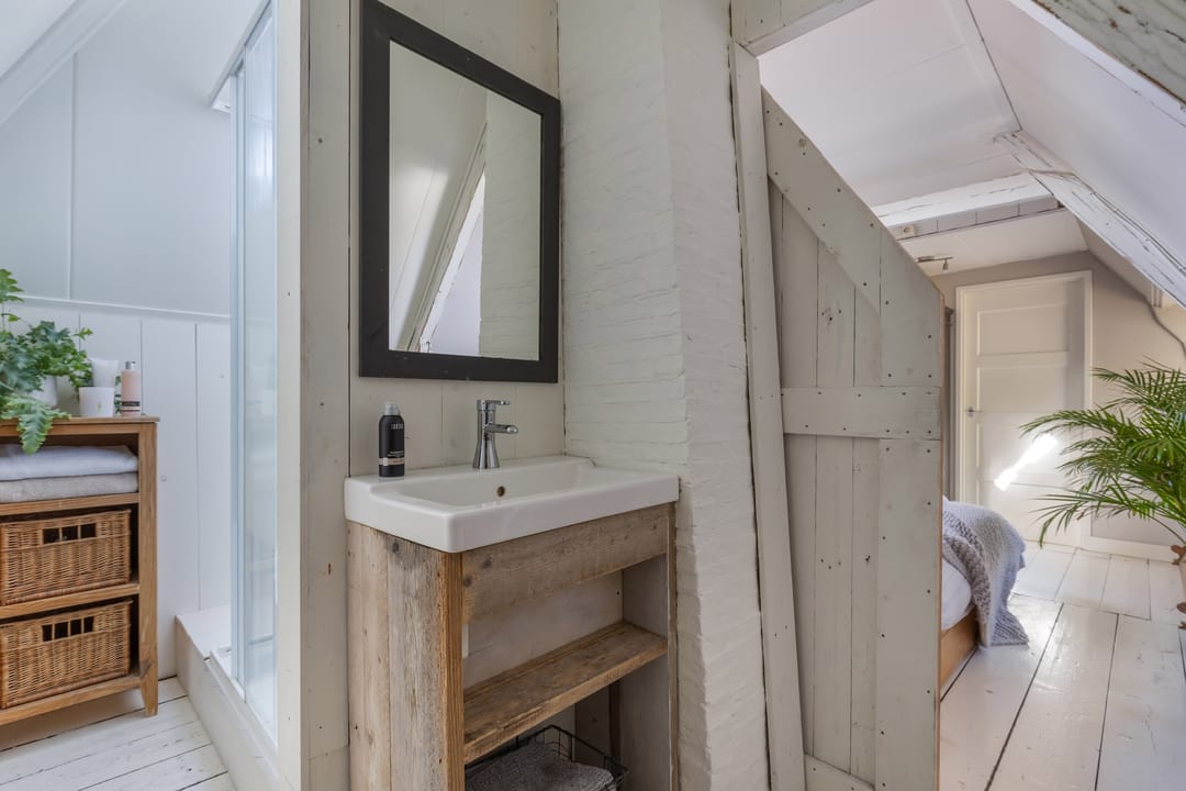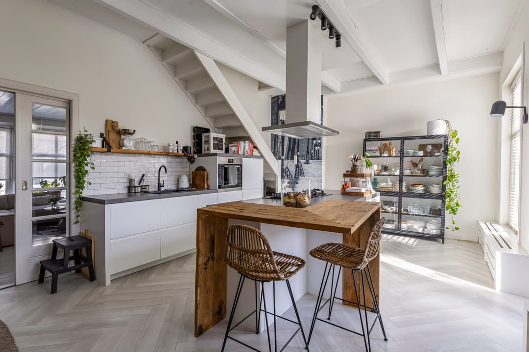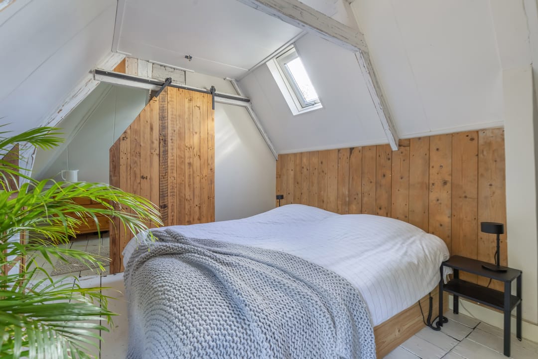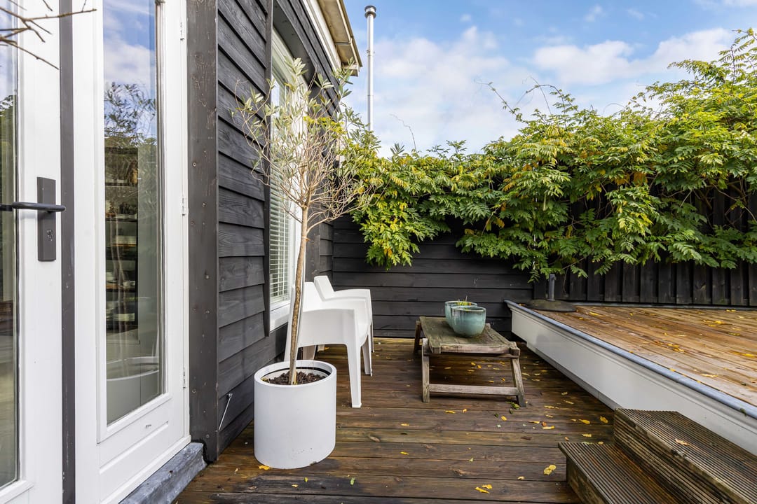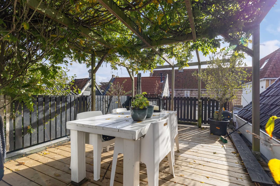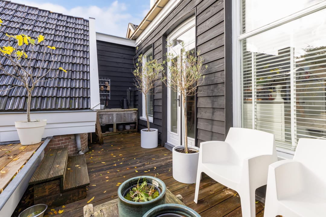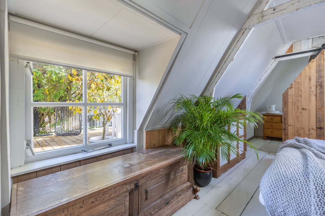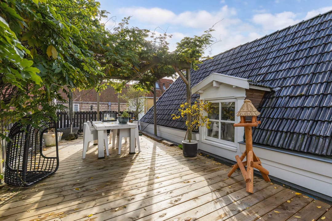De woonkamer is licht en ruim, met 4 grote ramen, originele houten plafonds en stijlvolle kleuren. De moderne keuken met kookeiland en inbouwapparatuur vormt het hart van de woning. Via openslaande deuren stap je zo op het zonnige dakterras op – een heerlijke plek om te ontspannen. Vanuit de keuken bereik je de wasruimte en een royale slaapkamer met eigen badkamer, voorzien van douche en wastafel.