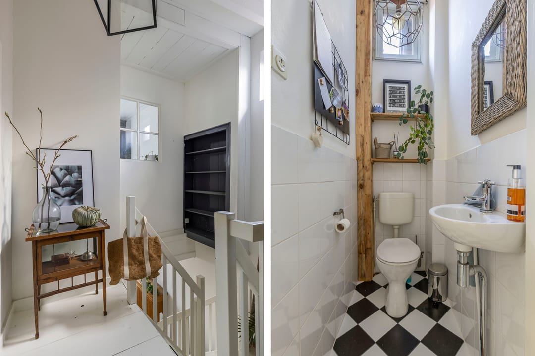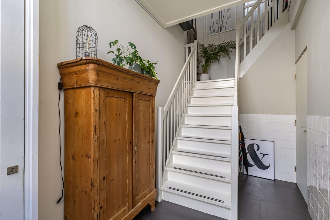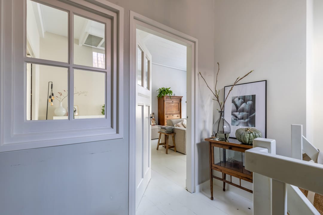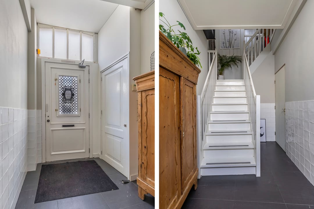 De entree van de woning bevindt zich naast de winkel. Via de lichte hal met trapopgang kom je op de eerste verdieping, waar direct de warme sfeer je tegemoetkomt.