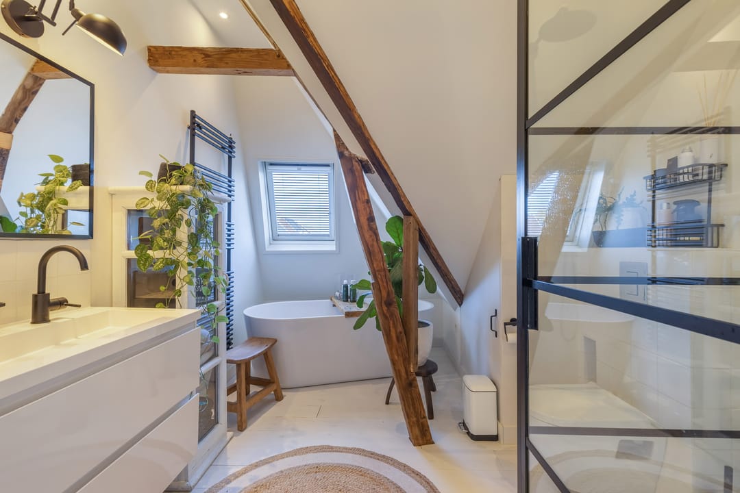 De tweede verdieping telt drie ruime slaapkamers – waarvan één nu dienstdoet als kantoor – en een tweede, luxe badkamer met vrijstaand ligbad, inloopdouche en stijlvolle afwerking in hout, groen en zwart staal. Alles is tot in detail verzorgd: instapklaar en met gevoel voor design.