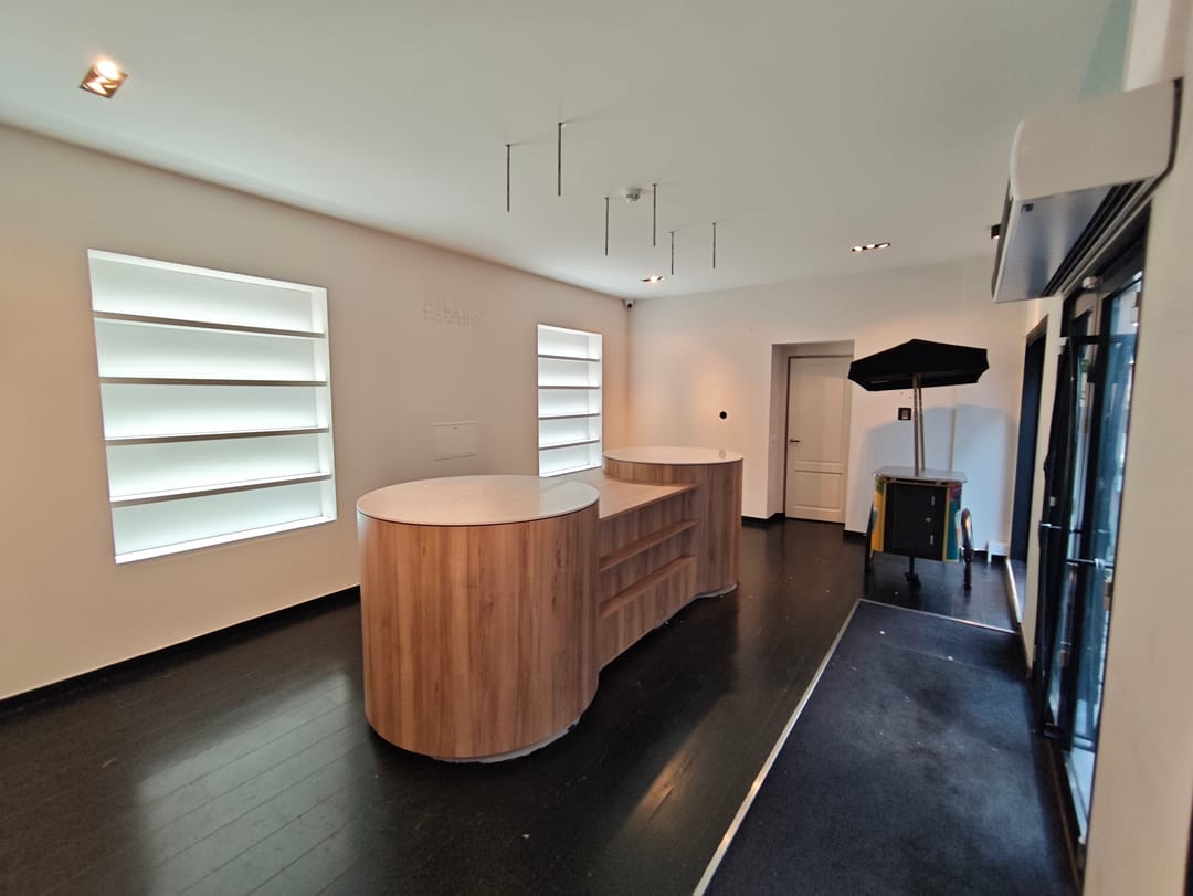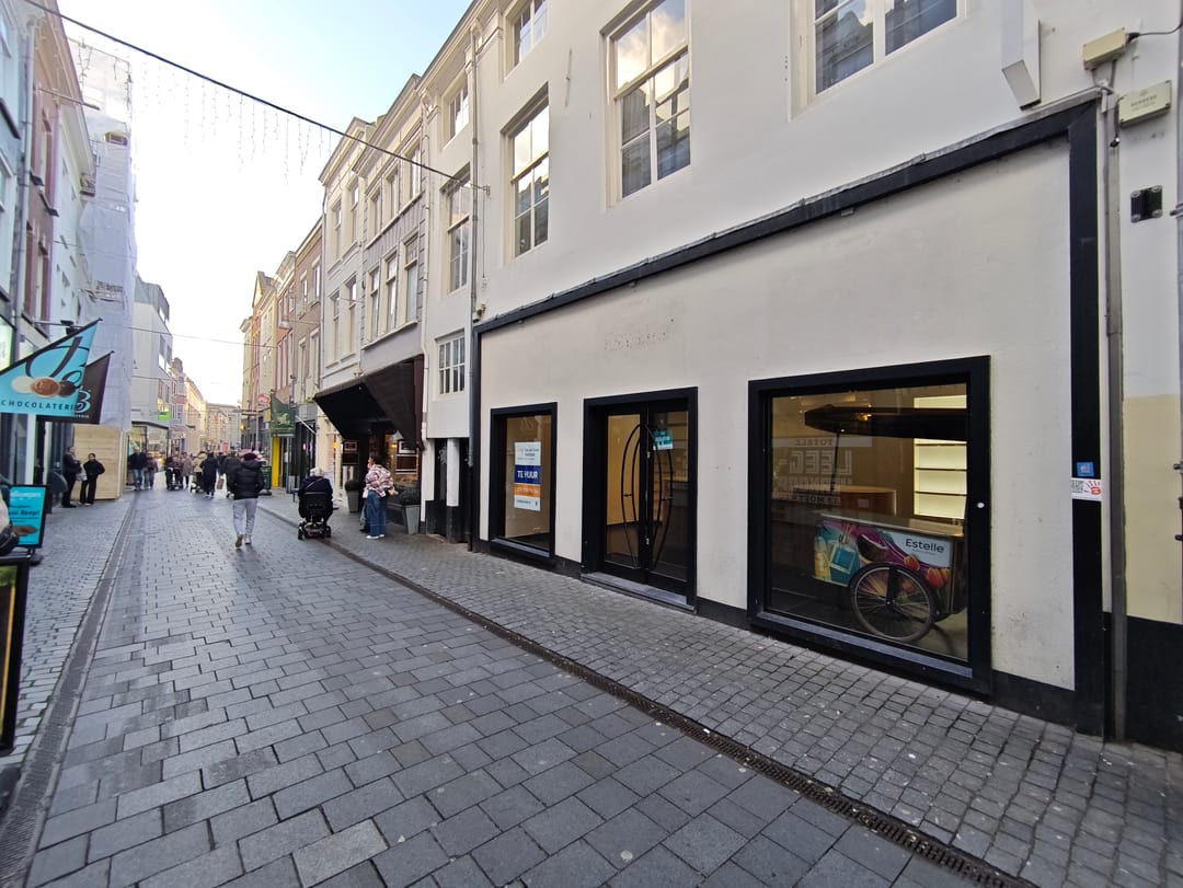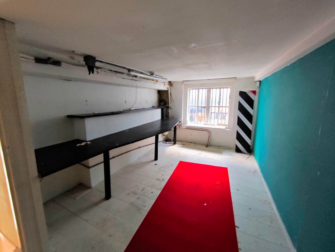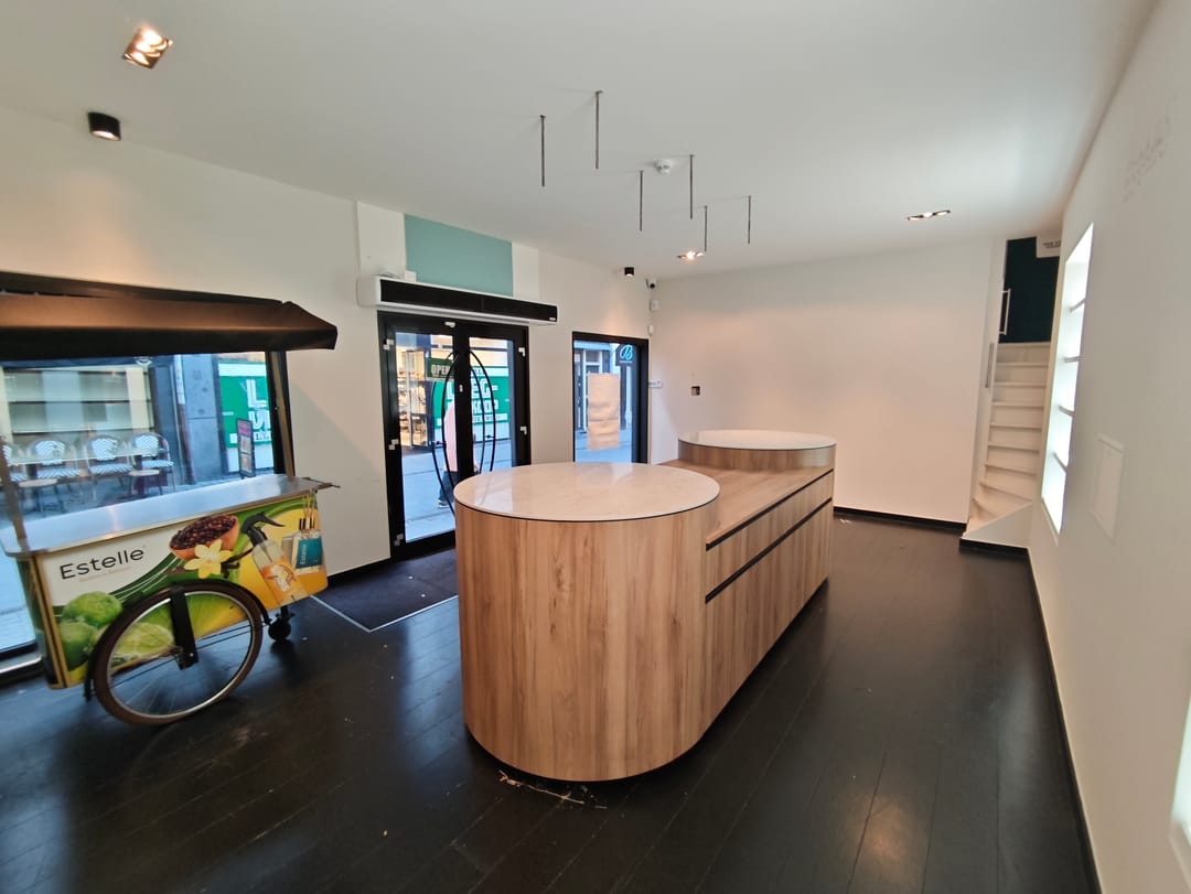 Nette en goed zichtbare commerciële ruimte van ca. 55 m² met een front van ca. 9 meter. Links achterin de ruimte bevindt zich een trap die toegang biedt aan een klein magazijn/kantoor (laag plafond).
