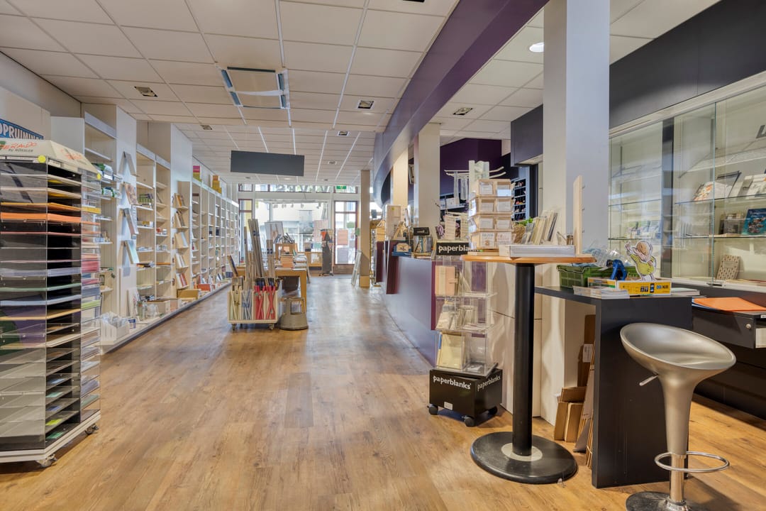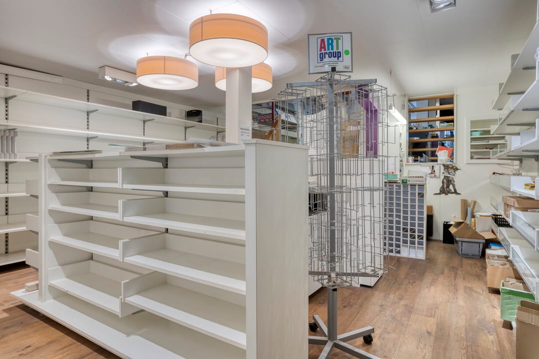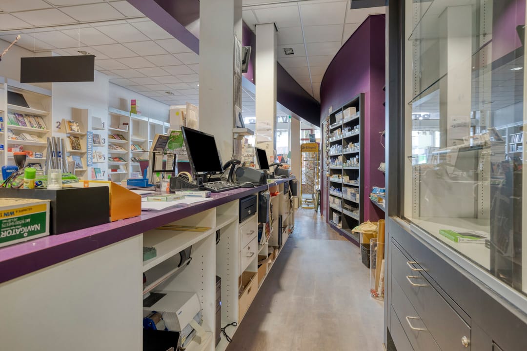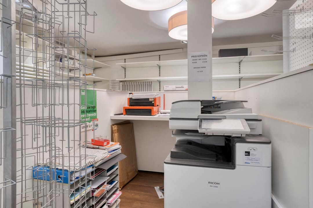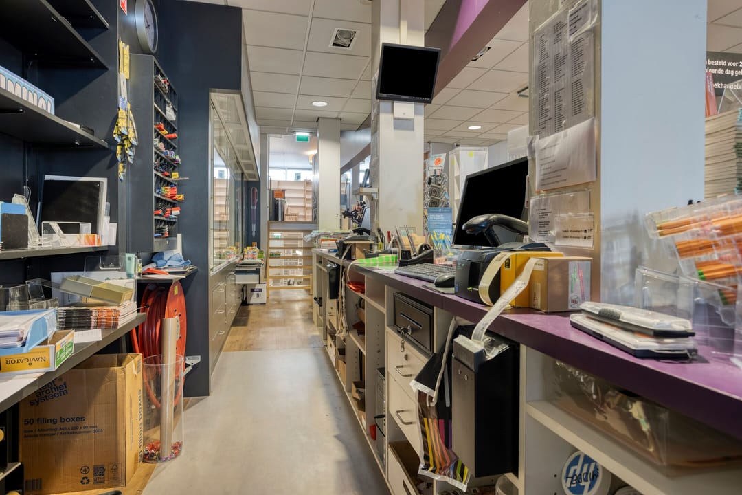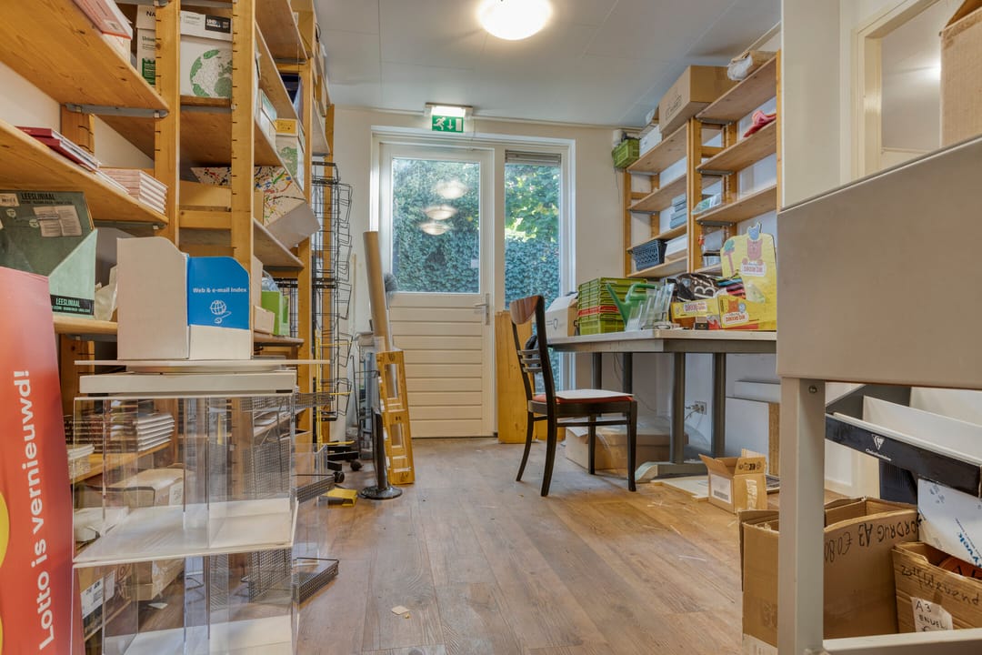 Commerciële ruimte met PVC vloer, toonbank, toegang tot kelder op stahoogte. Het achterste deel bestaat uit 2 verdiepingen, op de verdieping een pantry met o.a. een combimagnetron, een vaatwasser, een koelkast en spoelbak. Toilet met fontein.