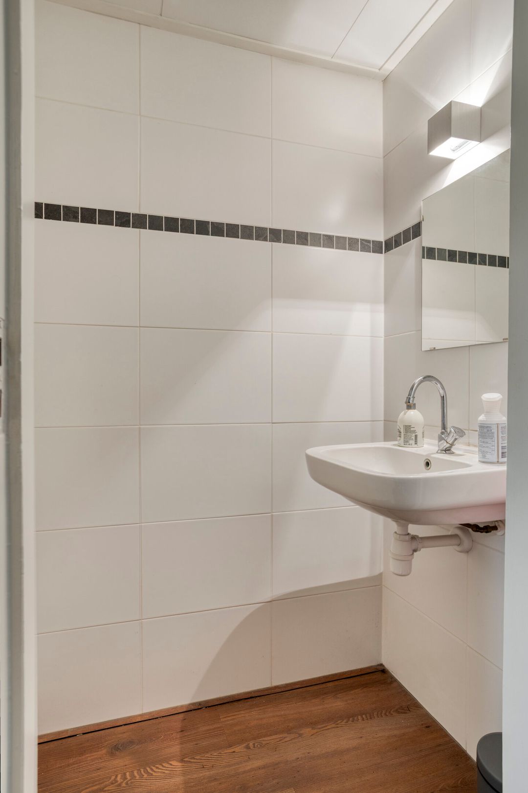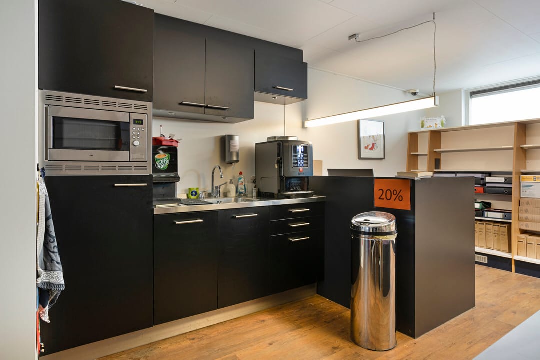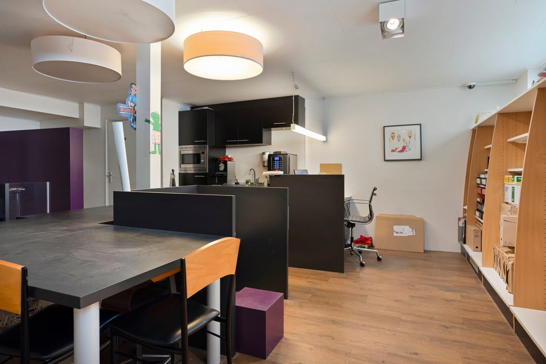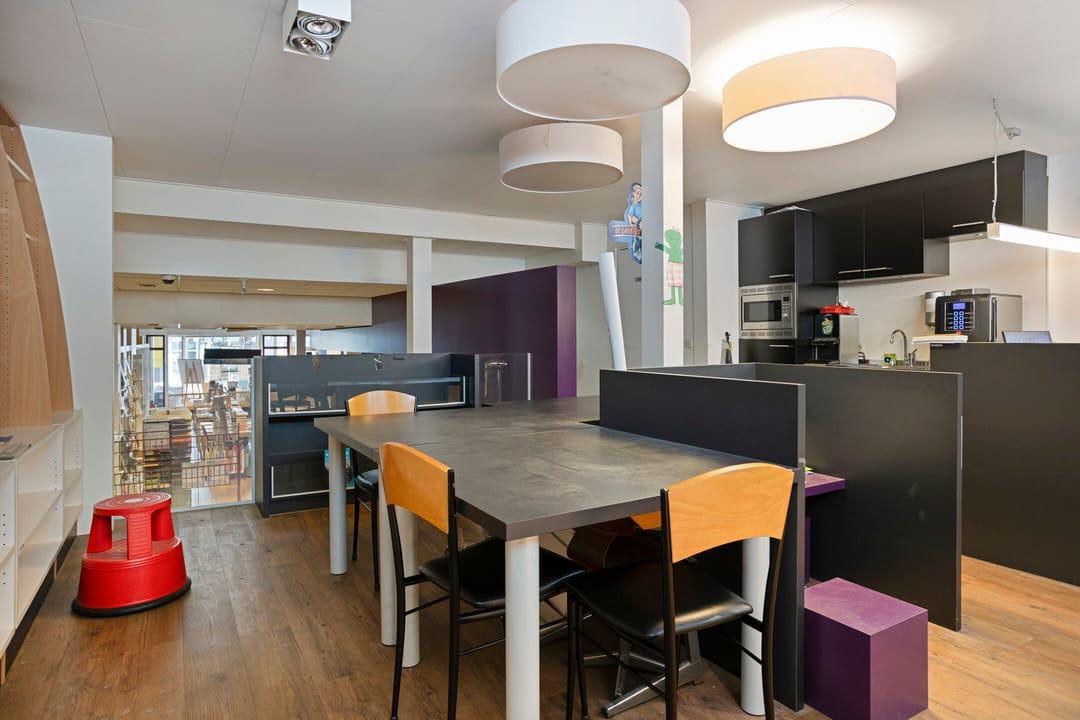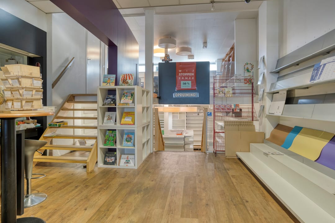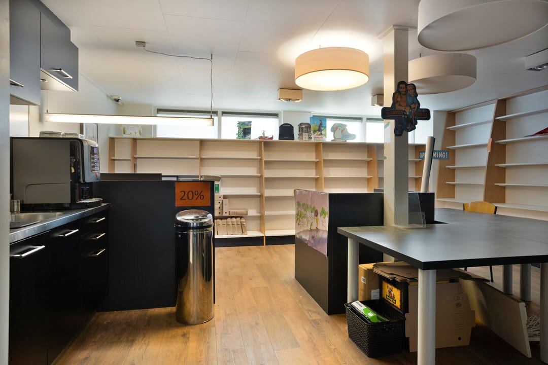 Commerciële ruimte met PVC vloer, toonbank, toegang tot kelder op stahoogte. Het achterste deel bestaat uit 2 verdiepingen, op de verdieping een pantry met o.a. een combimagnetron, een vaatwasser, een koelkast en spoelbak. Toilet met fontein.