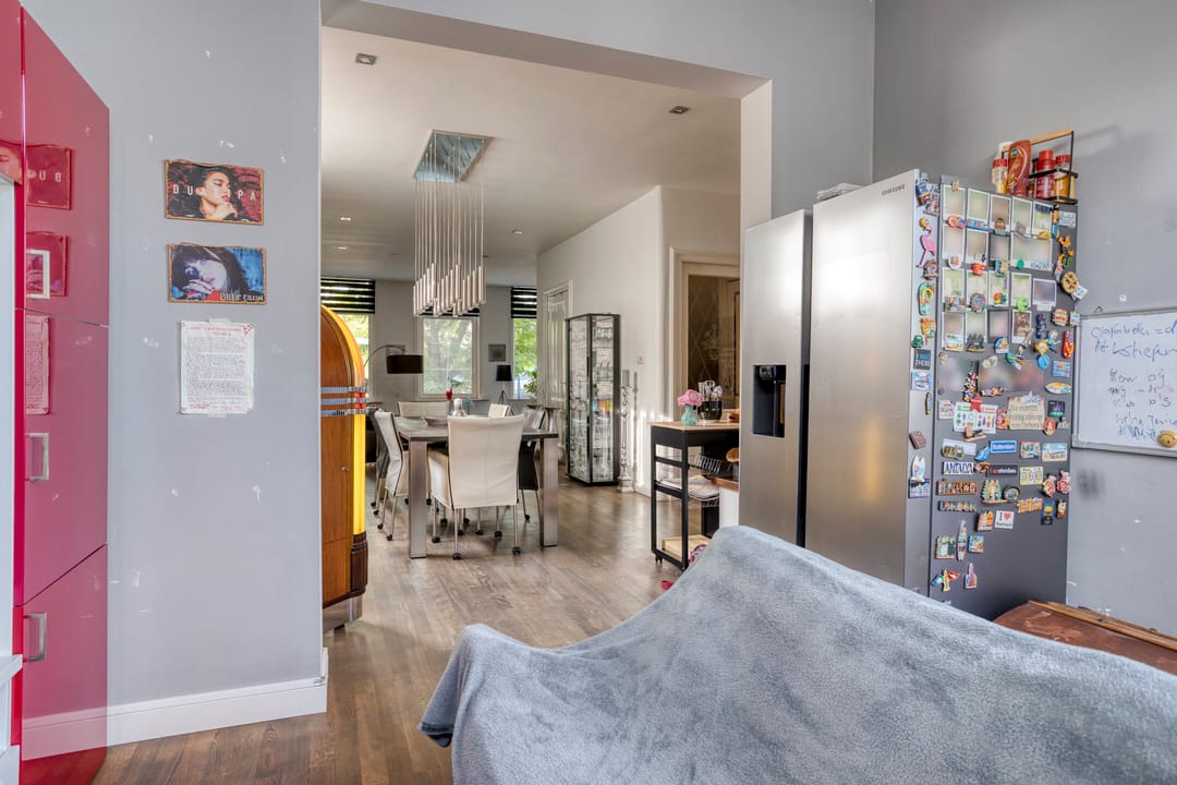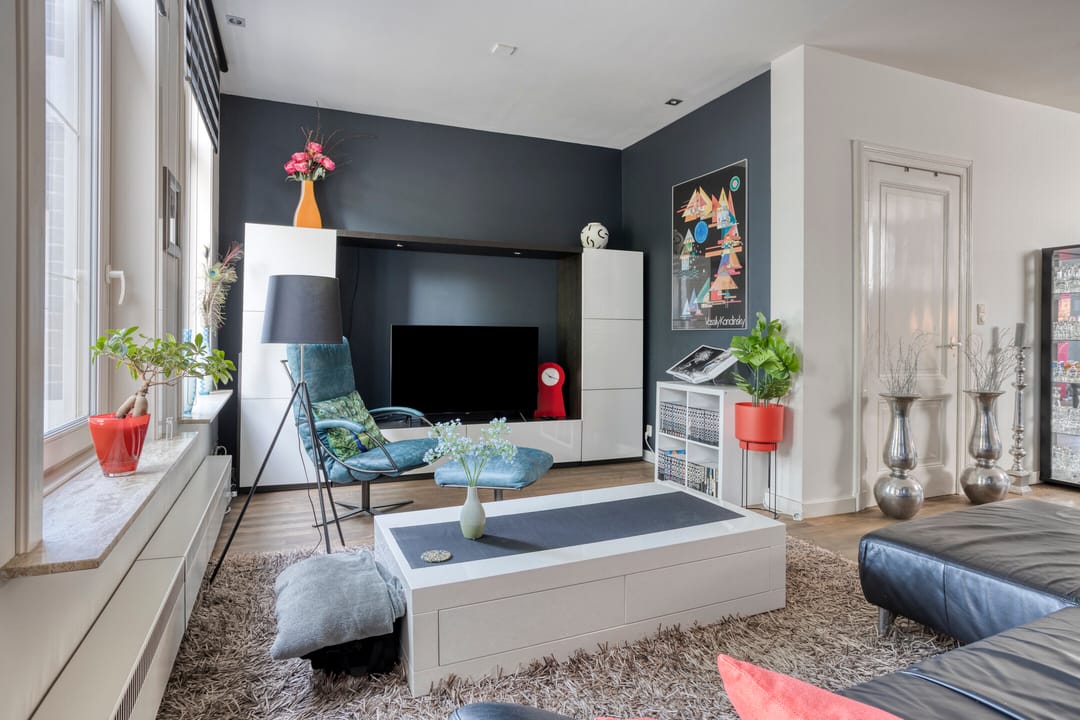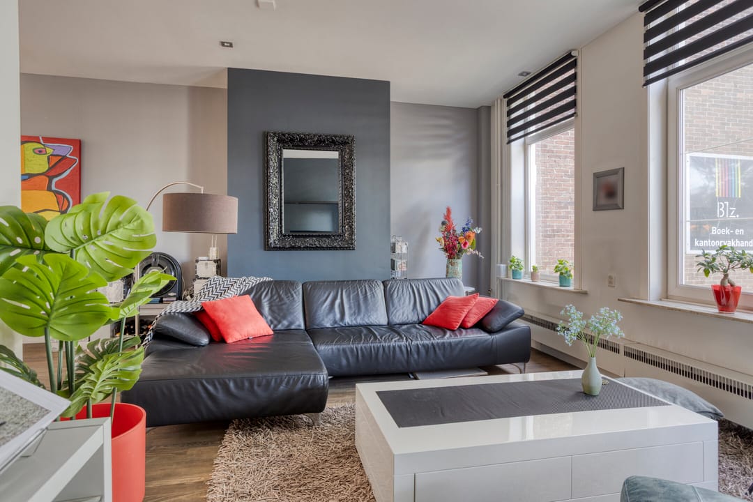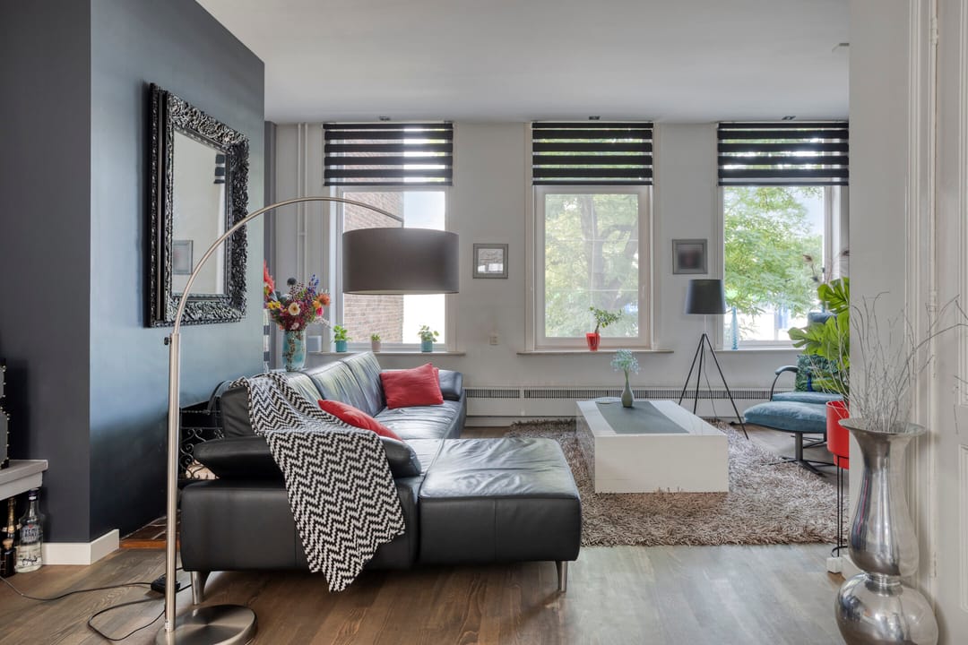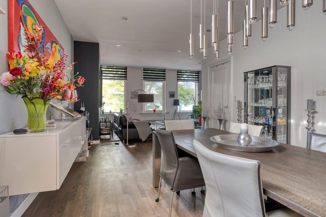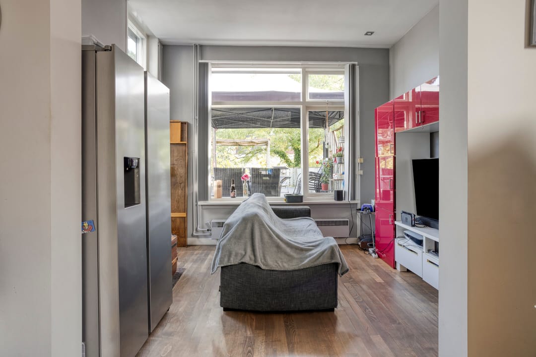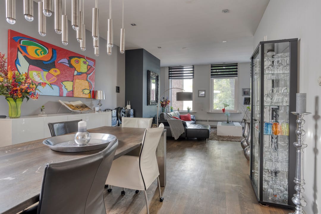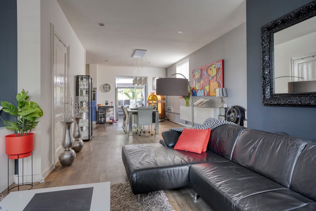 Riante, sfeervolle woonkamer in een L-vorm met open haard, parketvloer en uitzicht over de bruisende Ginnekenweg.
