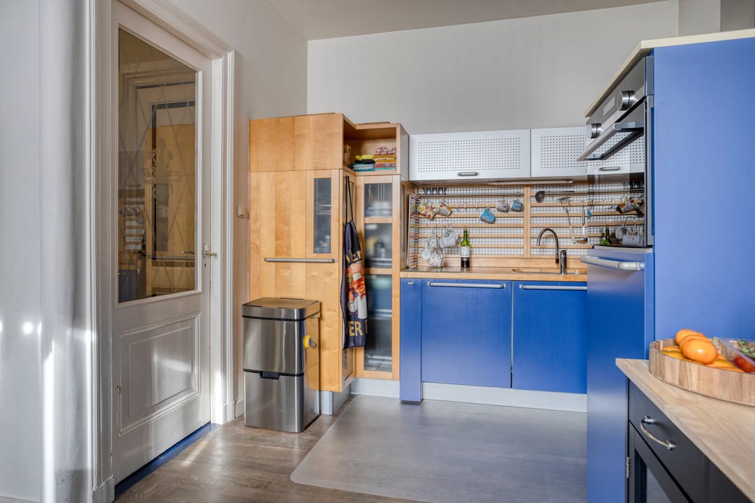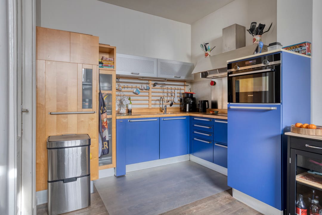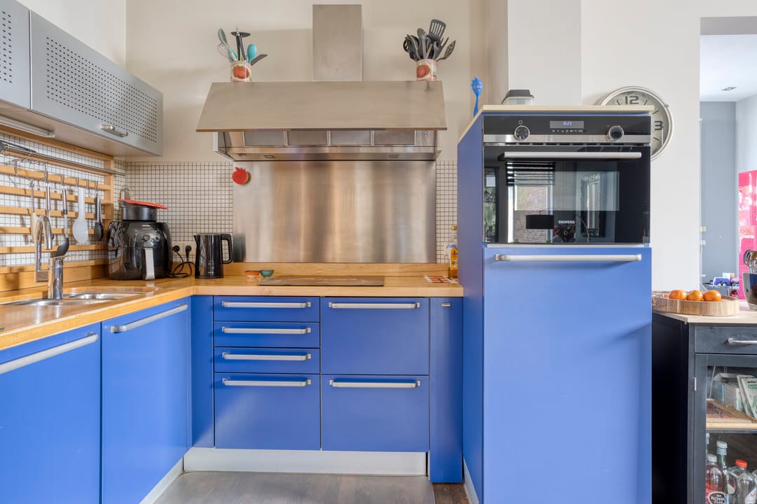 Open keuken met complete inrichting te weten; een inductie kookplaat, een afzuigkap, een vaatwasser en een combimagnetron.