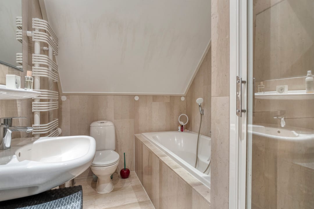 De ruime, betegelde badkamer is voorzien van een Duo ligbad, een douchecabine, een toilet, een designradiator en een wastafelmeubel.
