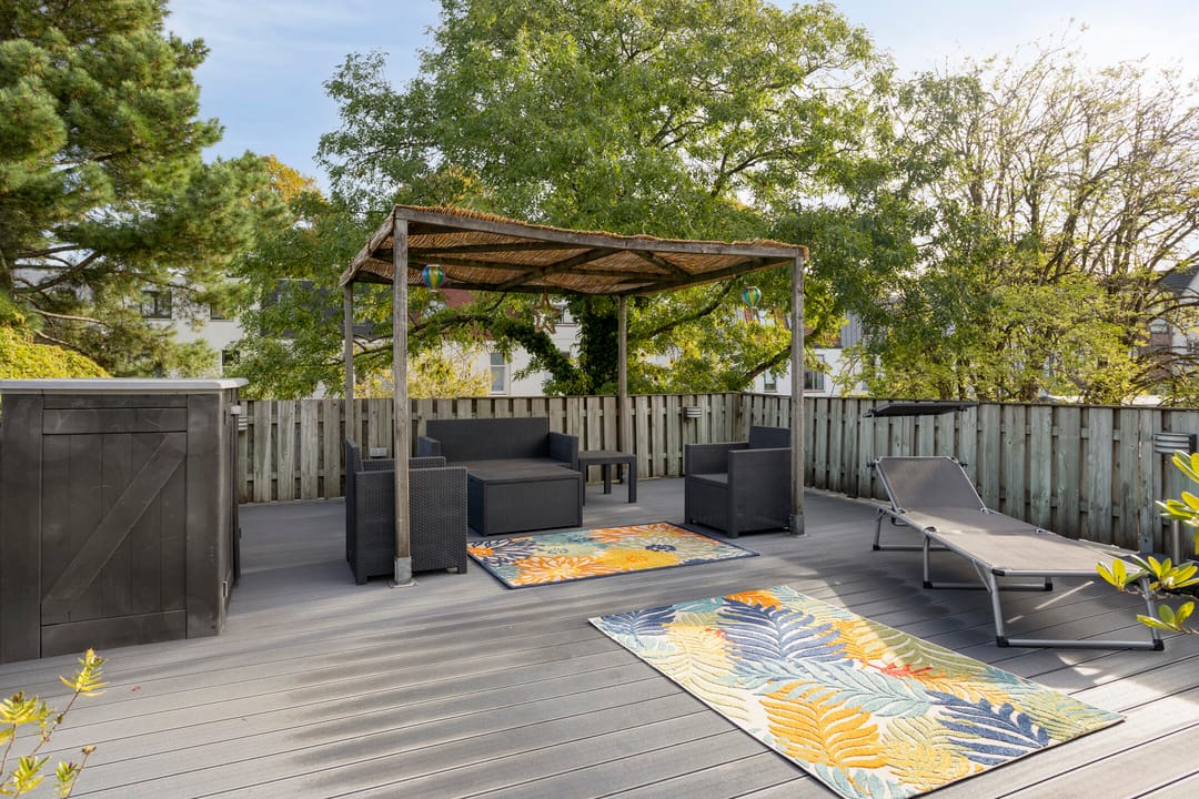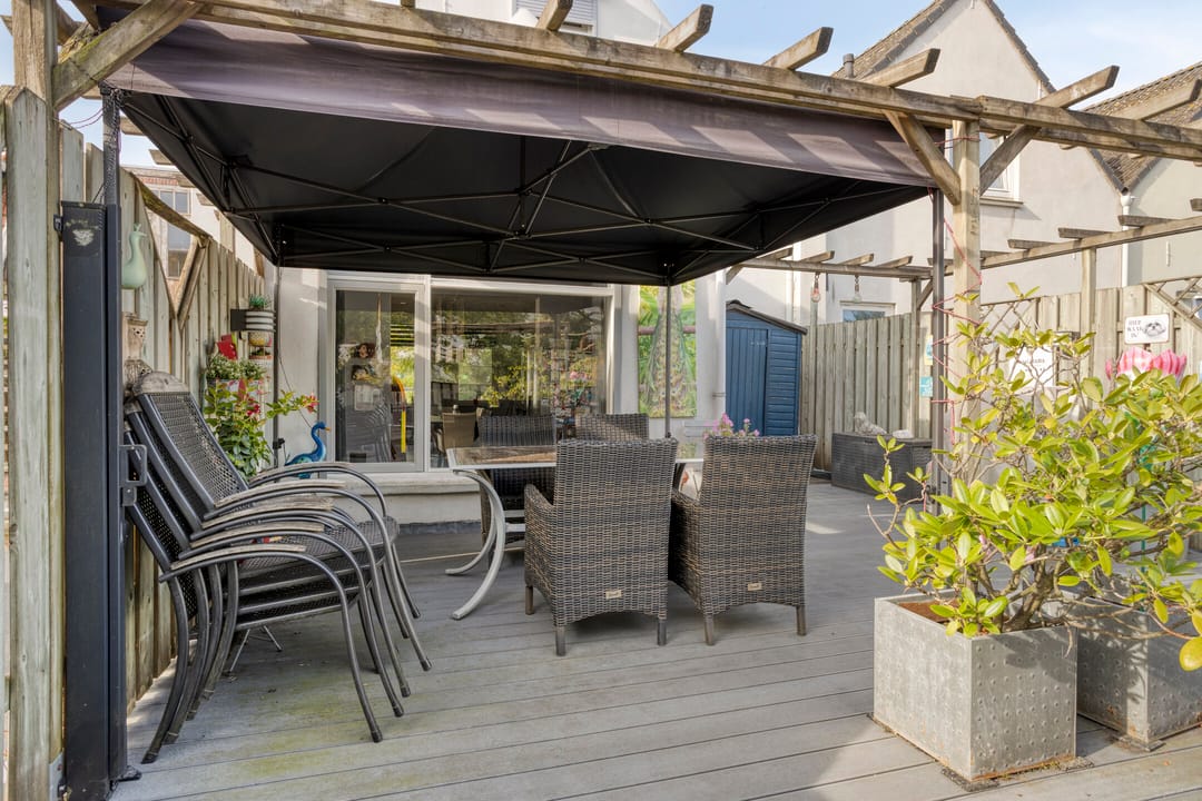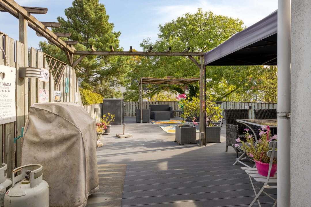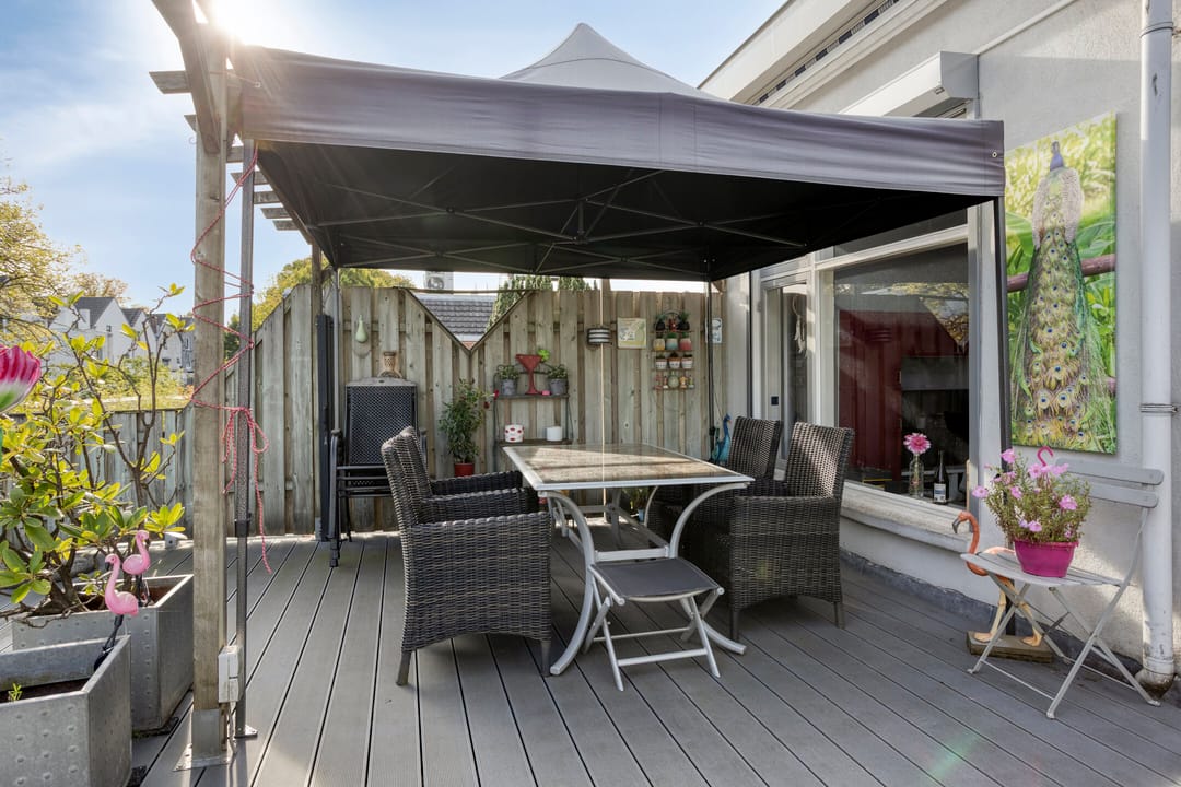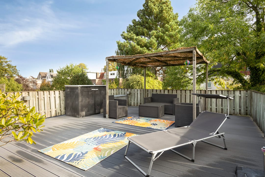 Aan de achterzijde een heerlijke tuin/chill kamer met toegang tot het royale dakterras.