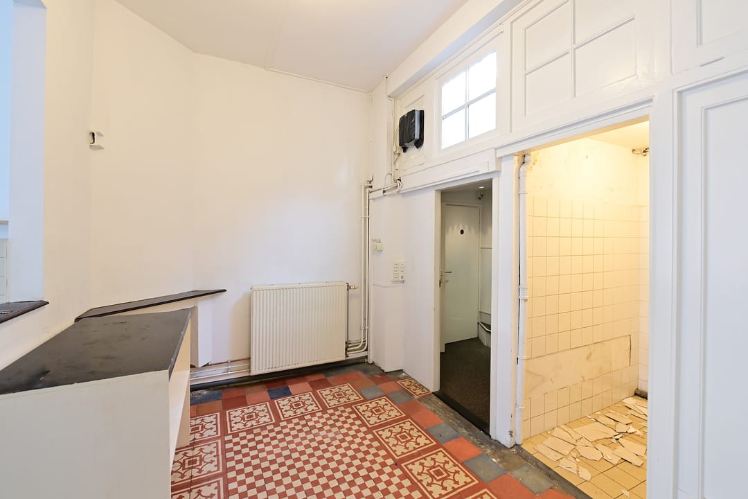 Entree, winkel/kantoorruimte met daarachter een aparte ruimte waar een keuken geplaatst kan worden, bergkast, hal naar 2 toiletgroepen, achtergelegen opslagruimte met deur naar achteruitgang, vaste bergkast met CV ketel.