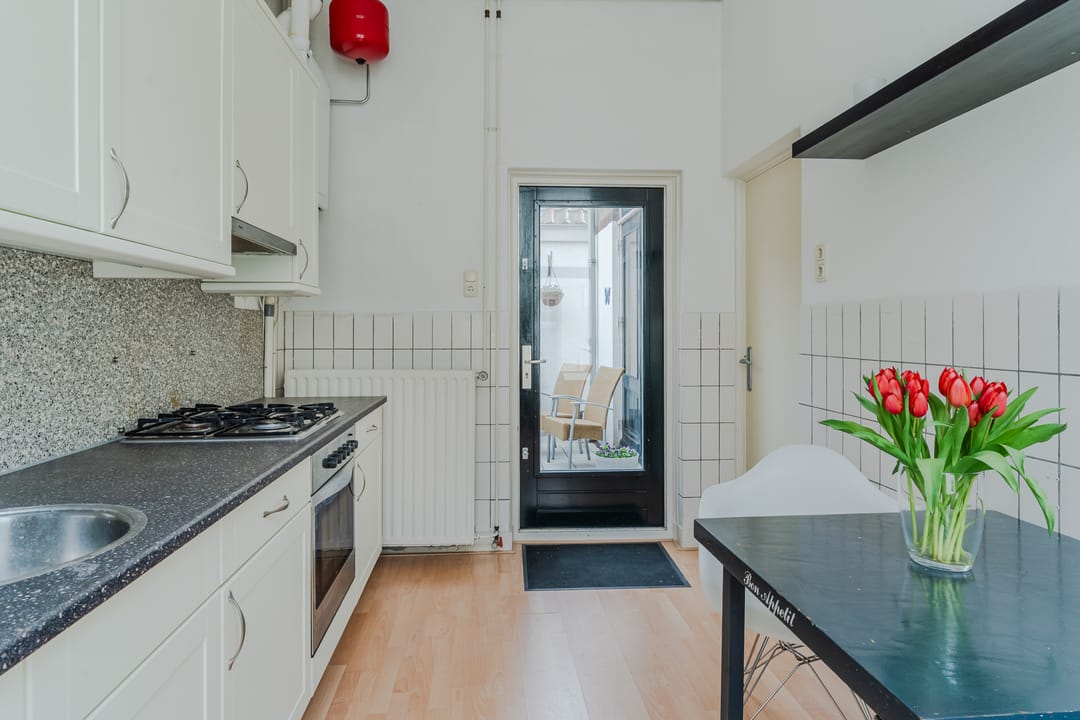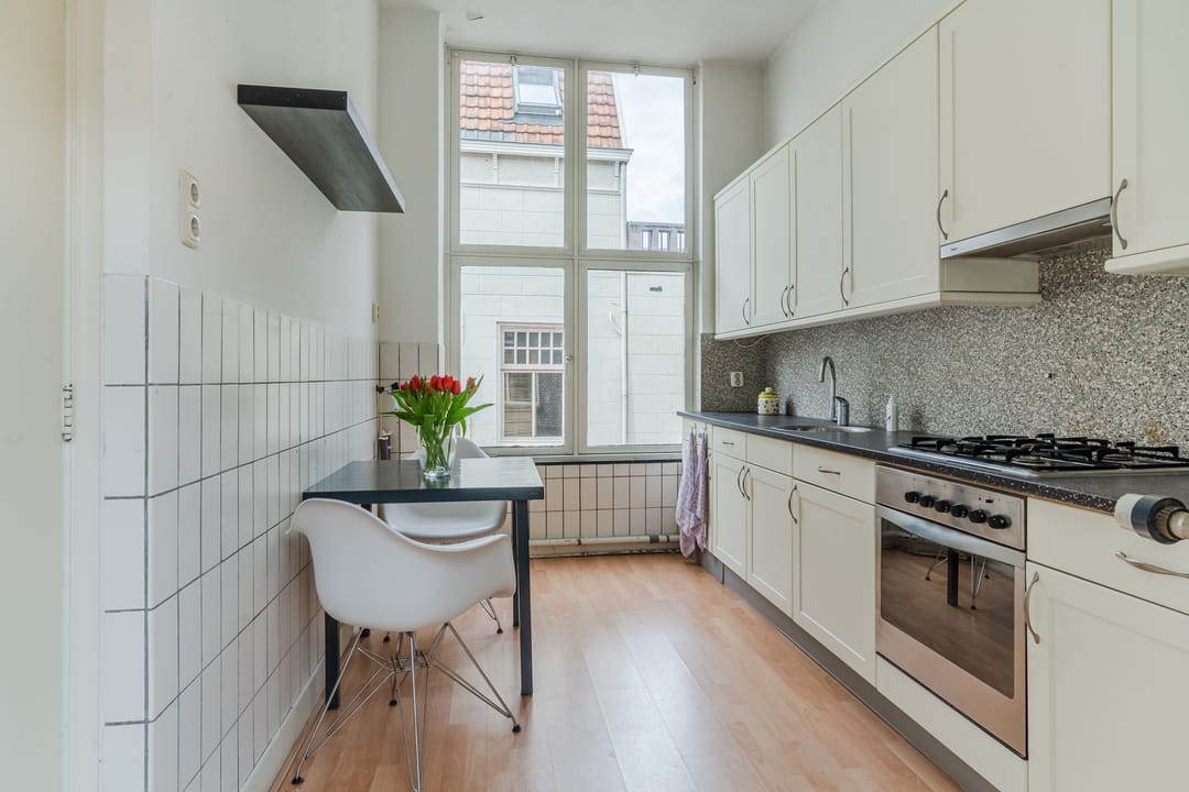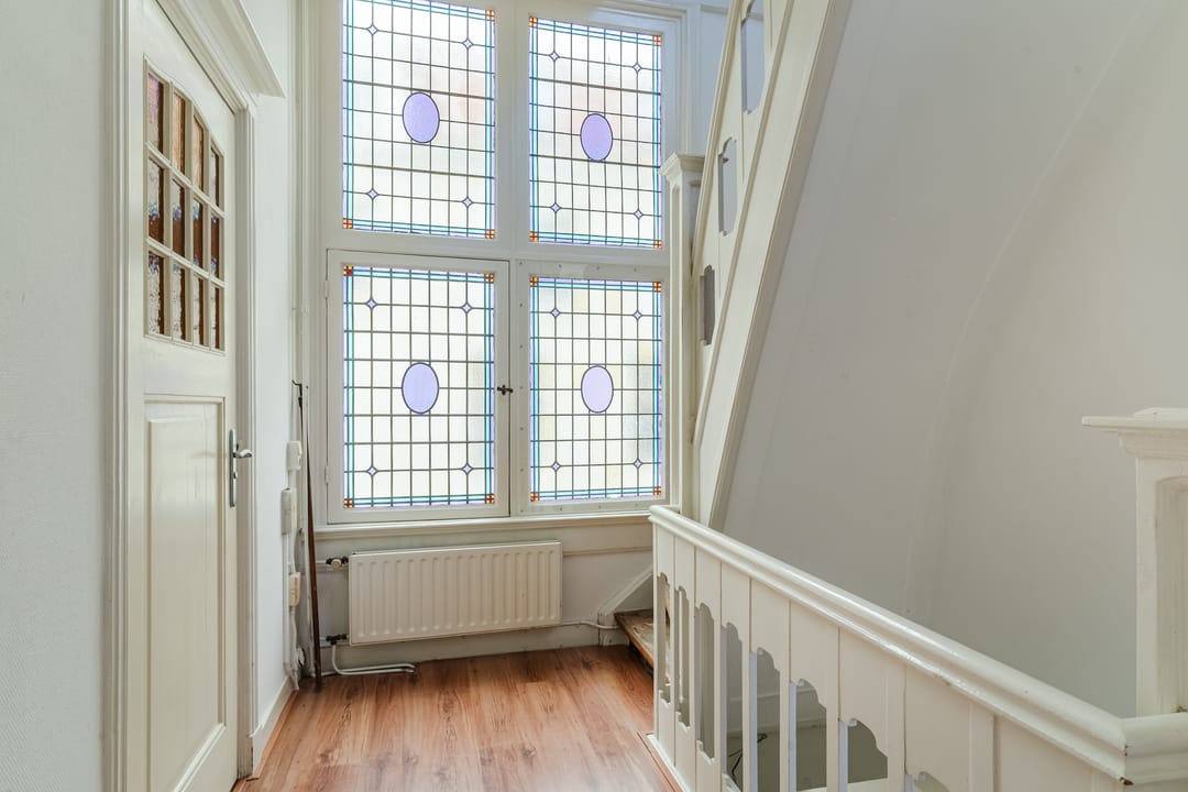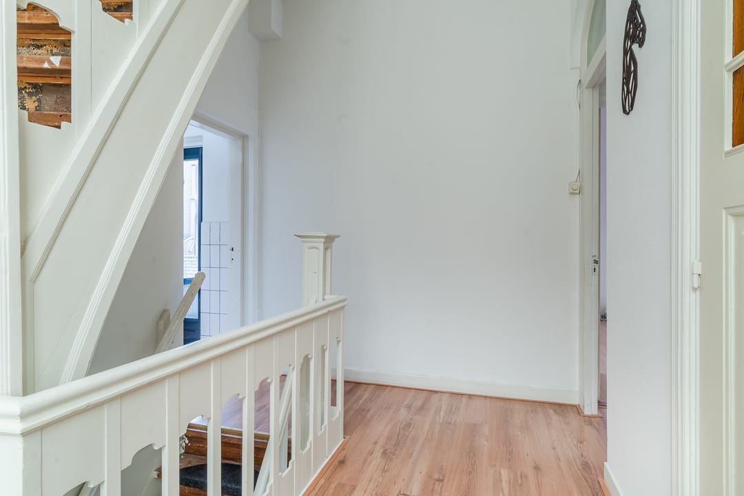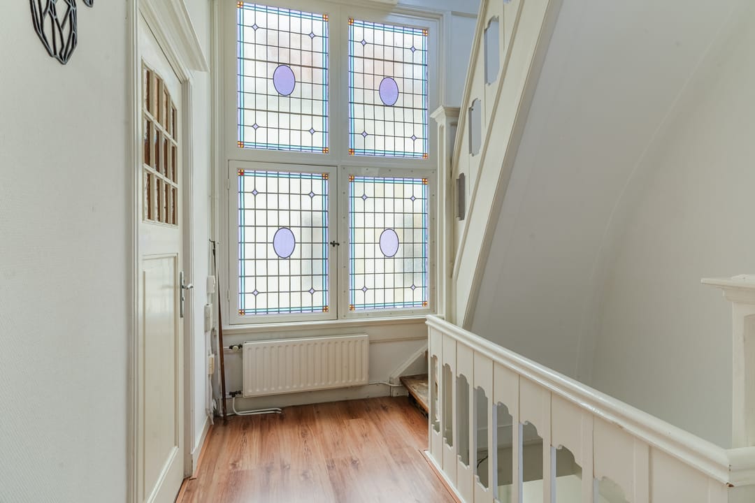 De ruime overloop waar de glas in loodramen een fraai lichtspel geven, geeft toegang tot alle vertrekken op deze woonlaag. Aan de achterzijde vind je de keuken. De keuken heeft een eenvoudige, maar lichte keukenopstelling met wat inbouwapparatuur. Ook vind je hier de opstelling van de cv-ketel. Vanuit de keuken is het balkon bereikbaar, waar je heerlijk van het ochtend zonnetje kunt genieten.