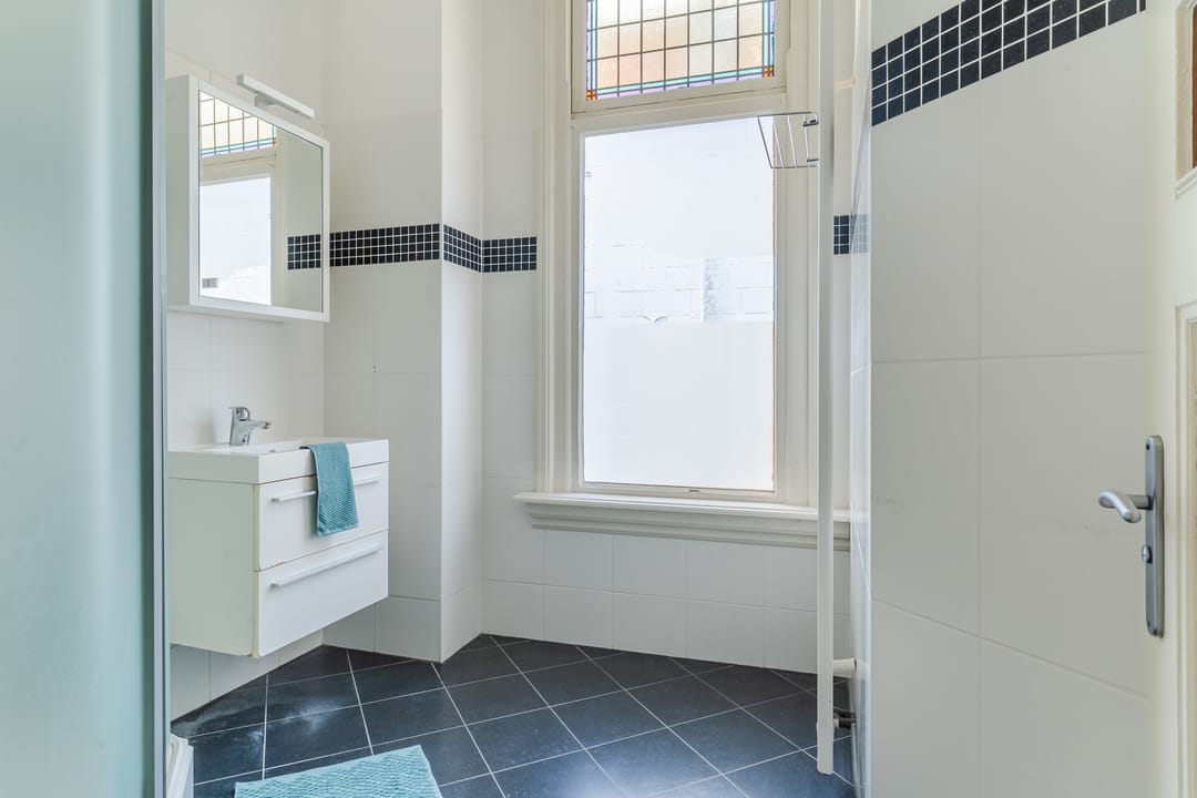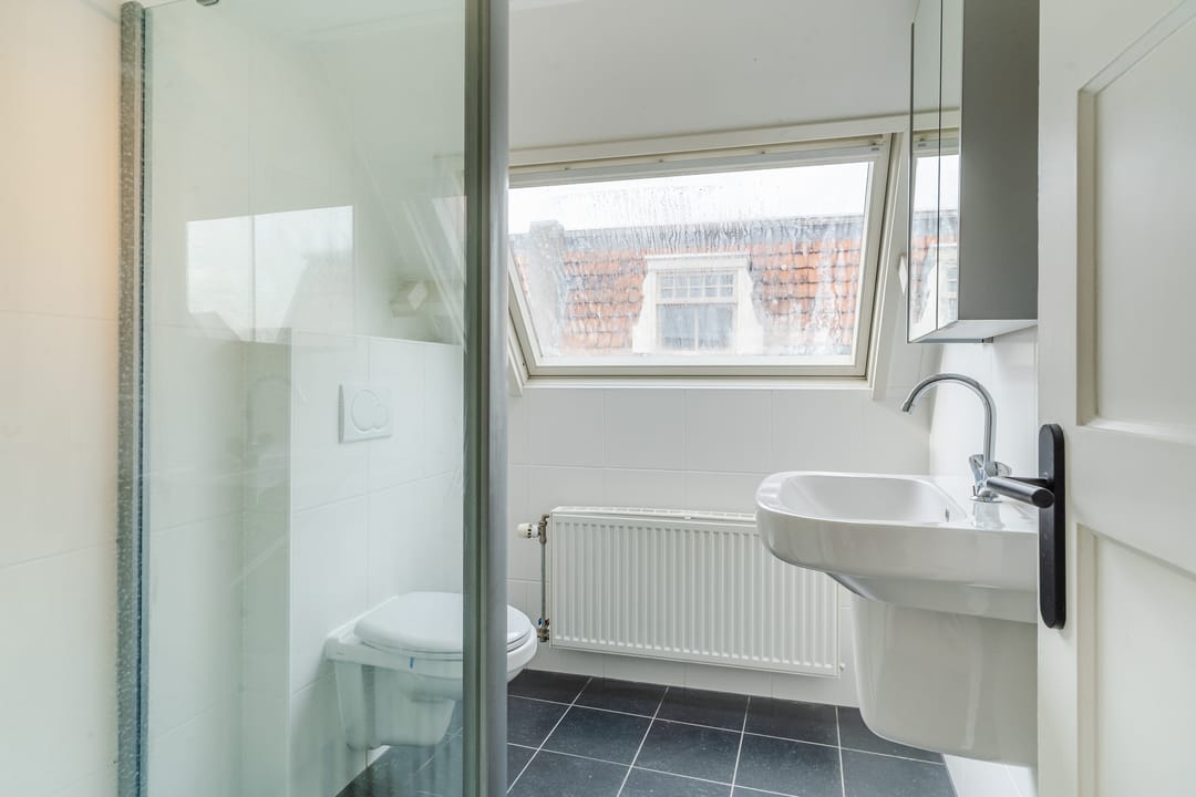 De badkamer is ook hier heerlijk licht door het grote dakraam en de badkamer is uitgerust met een toilet, een wastafel en een douche.