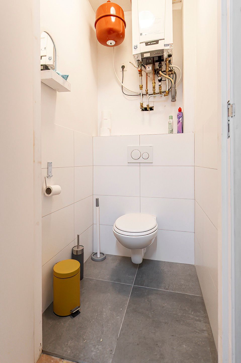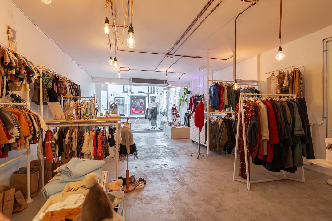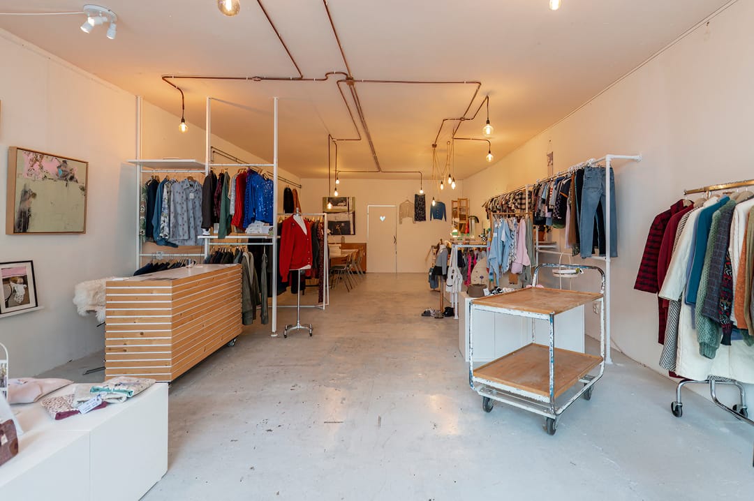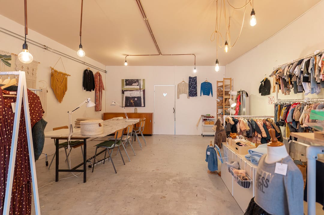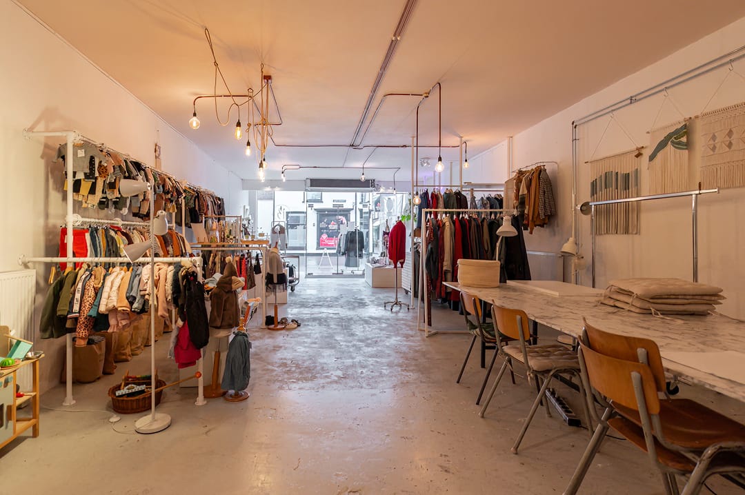- Basis keukenblok en net toilet, subtiel achter een lichte scheidingswand achterin de winkel